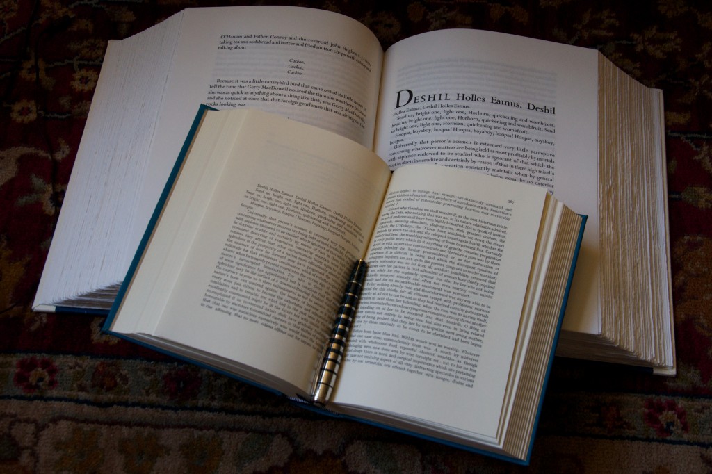 In the words of Sir Mix-a-Lot: “I like big books and I can not lie, You other brothers can’t deny…”. OK, I couldn’t resist that since it’s the first thing that came into my mind after reading your comment. Seriously though, I really love this book above all other editions of Ulysses. This is the edition I grab when I want to READ Ulysses. And I’m one of those that like to read Ulysses, and often. I think the size of the book fits the work; it makes sure I remember that I’m reading Ulysses. It doesn’t let my attention wander away. As you can imagine, some support is necessary. I would obviously grab something more manageable if I was taking the book on a trip or down to café or beach, but that goes without saying since my limited editions rarely venture out of the safety of my house or library. I’ll grab my trade edition if I’m quickly looking for a quote or favorite passage.