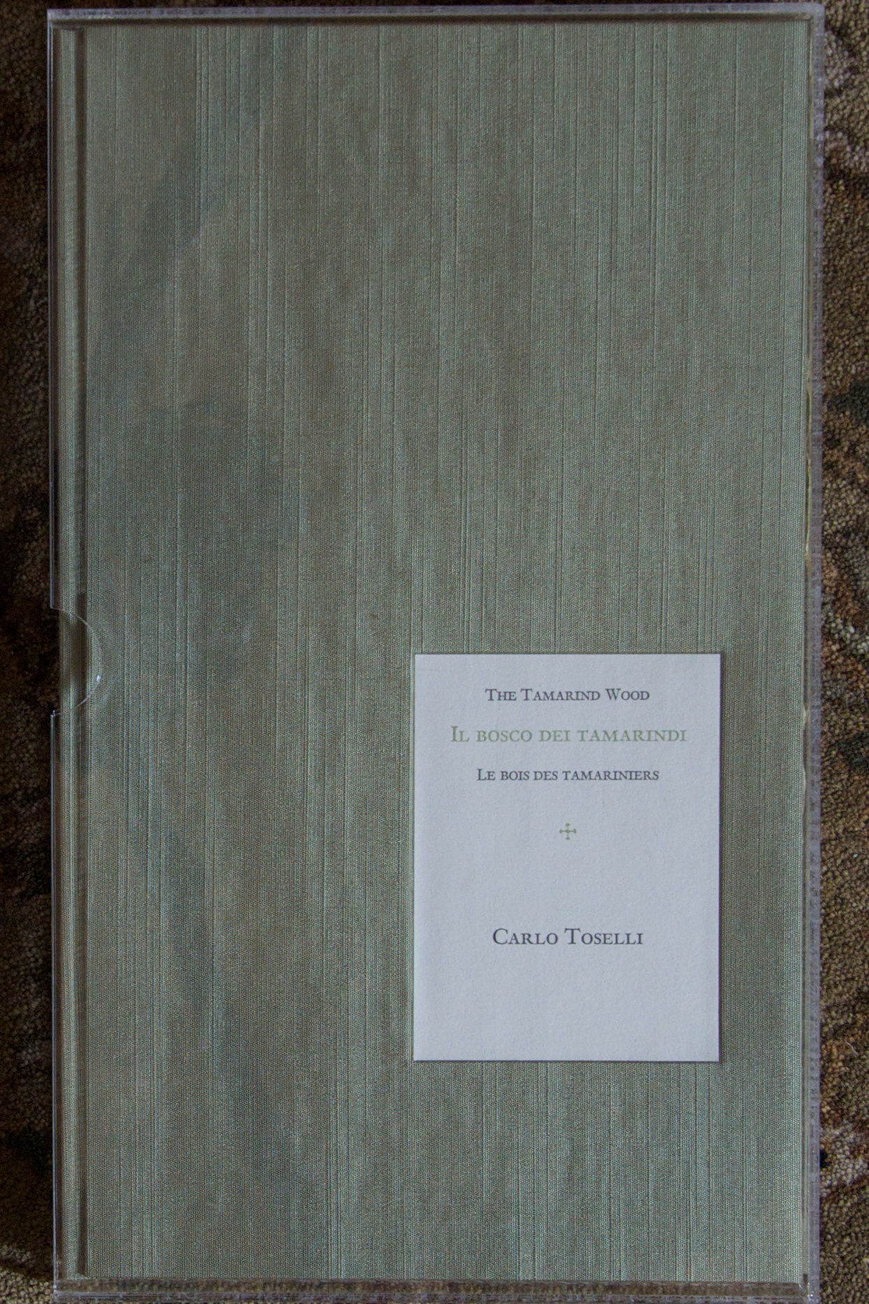 to show me the amazing Il Bosco de Tamarindi by Carlo Toselli they did for Le Grazie This book must have been a challenge for him to design as is a tri-lingual edition with each poem printed in Italian, with the French and English translation on the facing pages. It is also strikingly encased in a plexiglas(?) slipcase, a treatment I haven’t run across before.