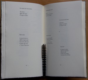 Since no translator is credited I assume that Toselli does the translations himself, which gives the poems a bit more authenticity than one might get in some translations. I’ve always been fascinated by the difficulty of translating literature, and poetry seems like it would be the toughest task of all. So I always look for bi-lingual books of poetry when I am buying a poet writing in something other than my native English. Then I can puzzle out some of the nuances of the poem’s translation for myself if it happens to be from a language I have a smattering of, like Spanish or French.