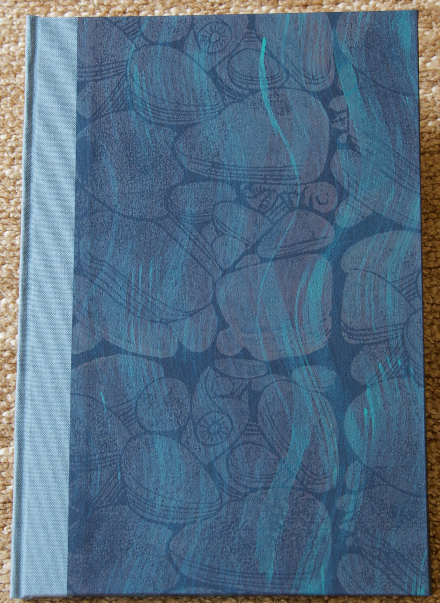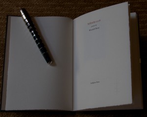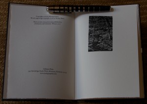 This is a lovely chapbook. Why is it so much less intimidating to read poetry in chapbook doses instead of big collections? You can read it in ten minutes. And you can read it again and again as you continue to digest and ponder the words. The wood engravings by Wesley Bates evoke the sense of place that so grounds Berry. The paper selected to cover the boards is perfect, bringing to mind the water running over the rocks in Camp Branch. It is quarter bound in cloth with a paper label running up the side. In a nice extra touch, they also provide a paper wrapper/dust cover with the title and one of the illustrations printed on the cover and the title again printed on the spine. I immediately covered mine with a dust jacket protector and hence don’t have to worry as much when I’m reading it as I do with some of my fine press books.