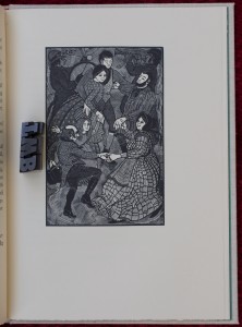 A sad reality check from my perspective 25 years later, since I hope to obtain A Christmas Carol someday and would love to also have seen at least The Cricket on the Hearth published. More’s the pity as this edition of The Chimes is a beautifully designed book. I’m not sure the team of Jan & Crispin Elsted has an equal when it comes to book design. Certainly some of the most beautiful books in my library are Barbarian editions. The cover of the book is stunning. The front cover has the title printed on a paper label along the whole length of the front cover. The title, subtitle, author information, and borders are printed in letterpress with three colors along with one of Colin’s engravings. (The green borders running up the sides of the cover label reminded me of the upcoming Barbarian Press book focusing on Curwen Press Borders. The book is titled Bordering on the Sublime and will be a treat for booklovers that are interested in this area of printing ornamentation). The illustrations by Colin Paynton are wonderful, and I really like the border he created for the title page. The addition of a ribbon to help remove the book from the slipcase is a nice feature not often seen, and is very useful given the buckram used on both the book and the slipcase.