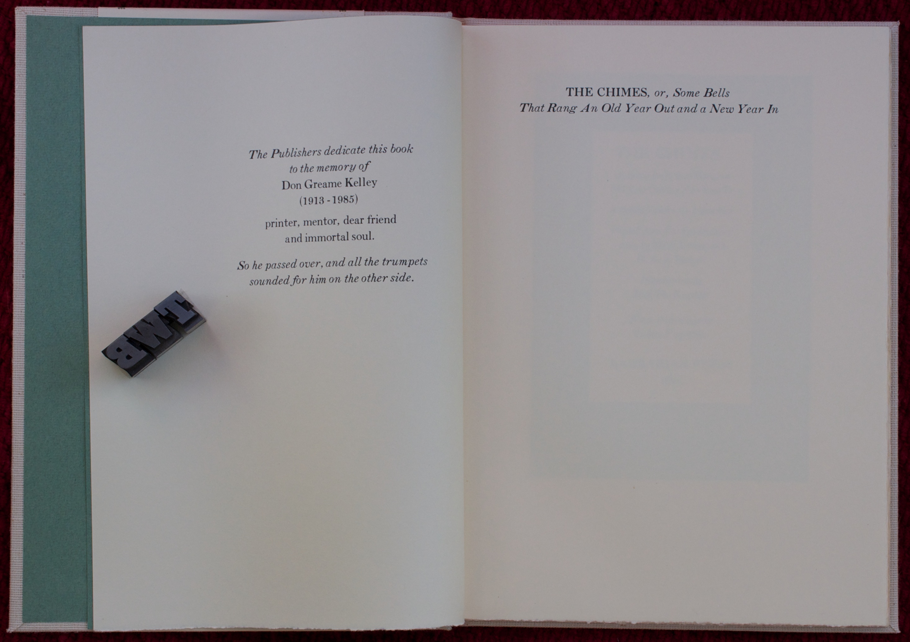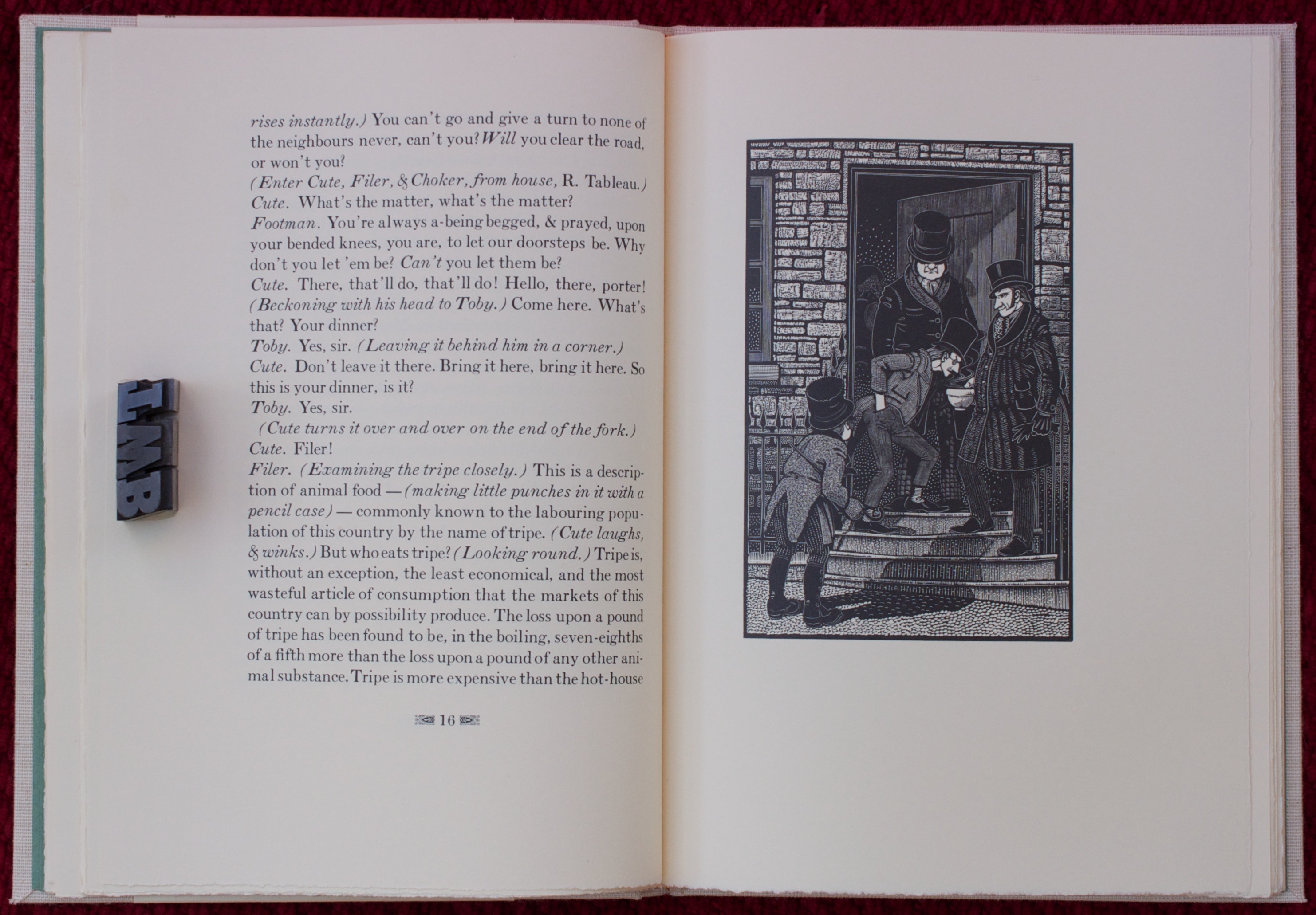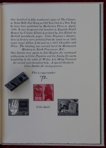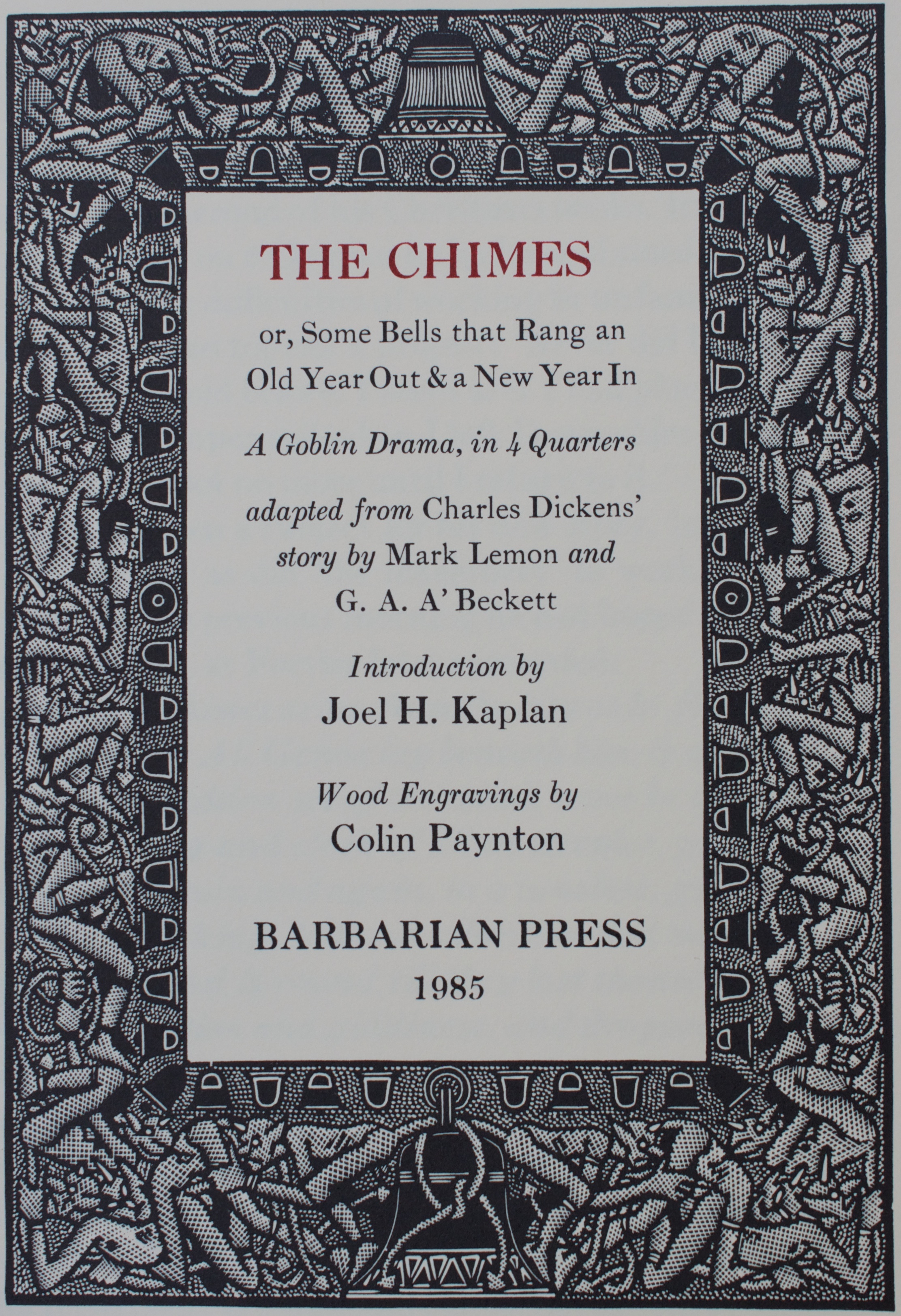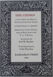 “Despite the beauty of Colin’s engravings & the interest of the text, sales of The Chimes were disappointing, and we were finally forced to give up our plans for the remaining three Dickens adaptations. The counterpoise between commerce and common sense—which are, we feel, mutually exclusive—provides some of the more sensational moments of despair in the lives of private press publishers.”