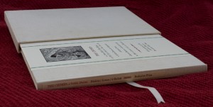 Scotch roman and italic. Red & black on Zerkall mouldmade. Half natural buckram with centred strip of paper running from head to foot of upper cover, printed in red, green & black. Spine label printed down in red & black. Endpapers of Ingres Ivy. Slipcase of natural buckram over boards with green or white ribbon. 150 copies. $120.00