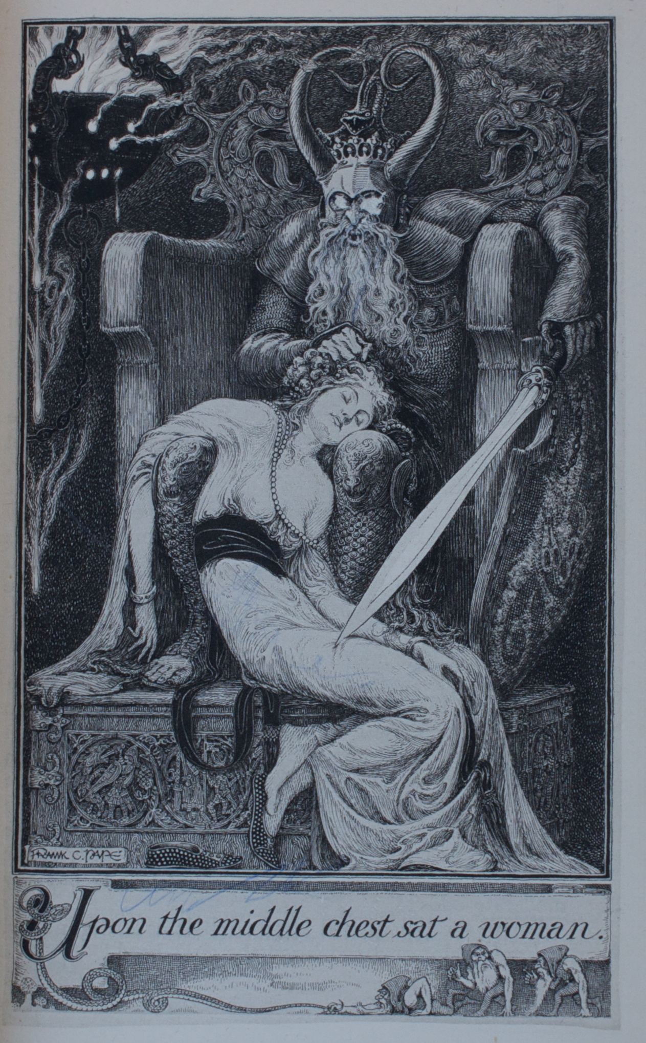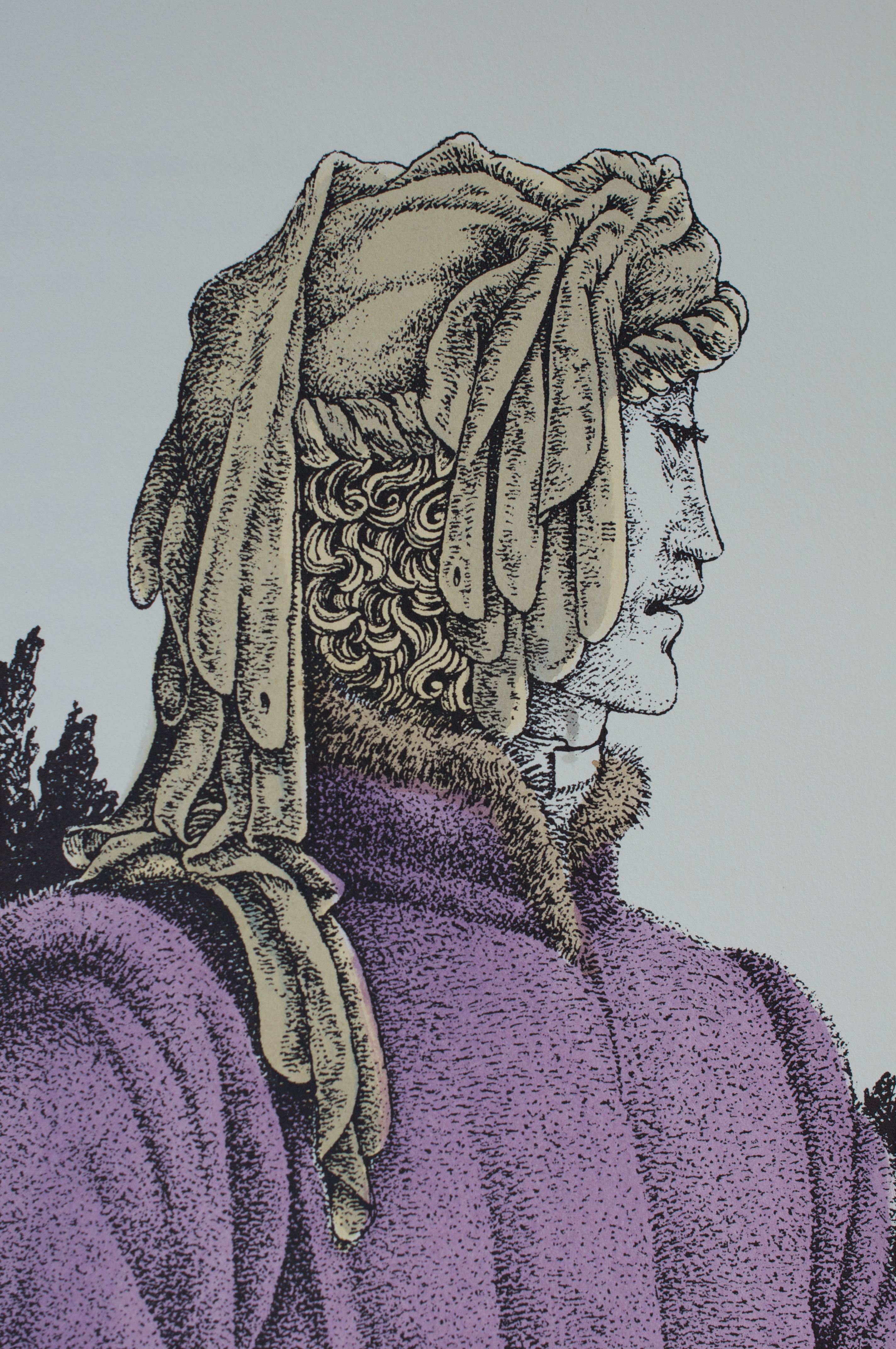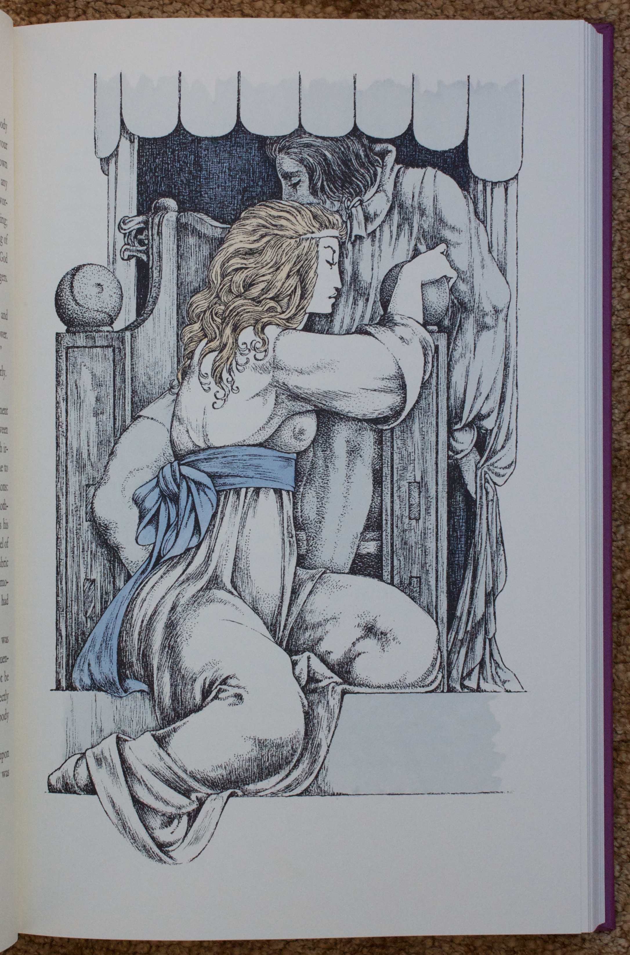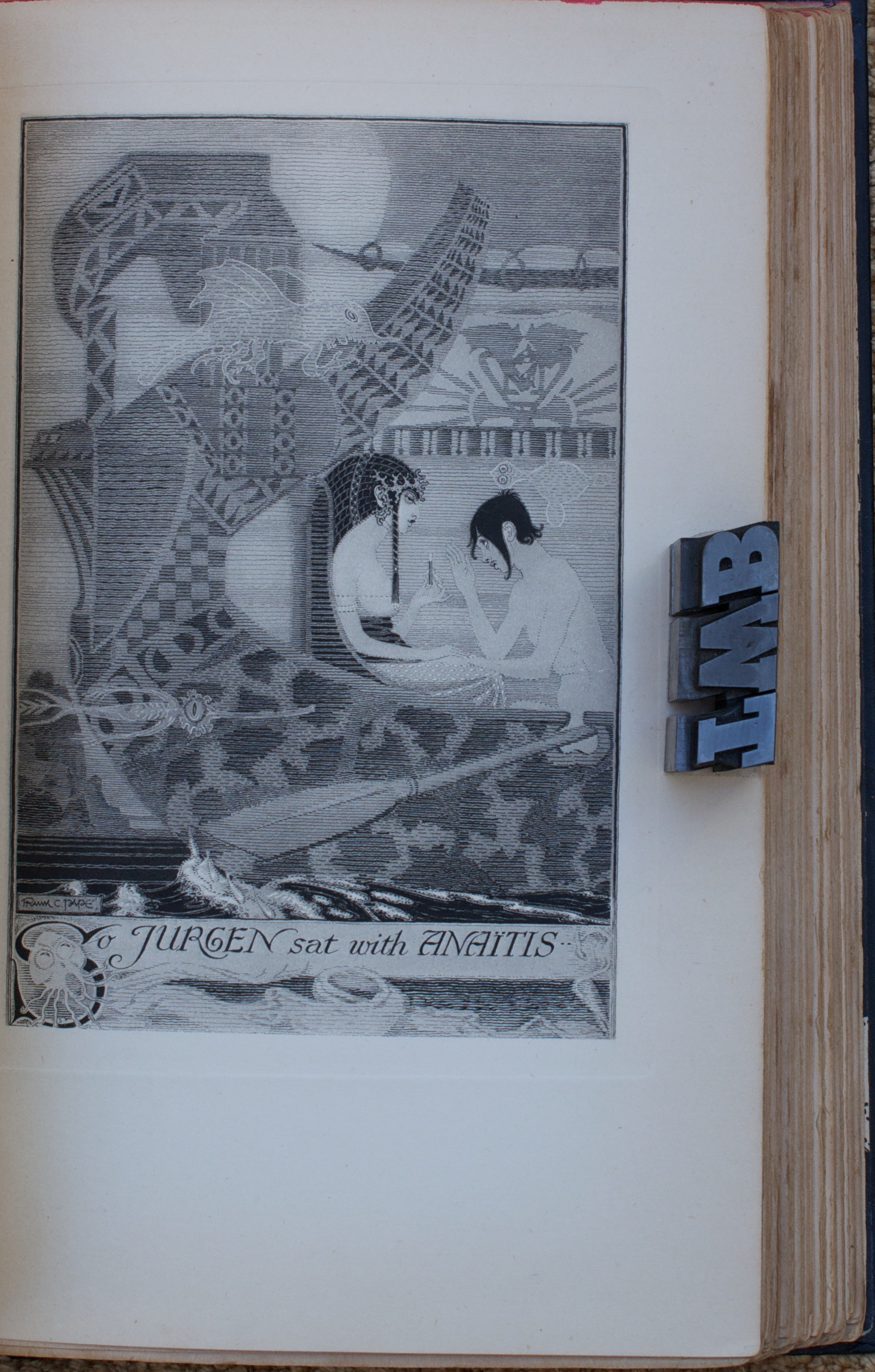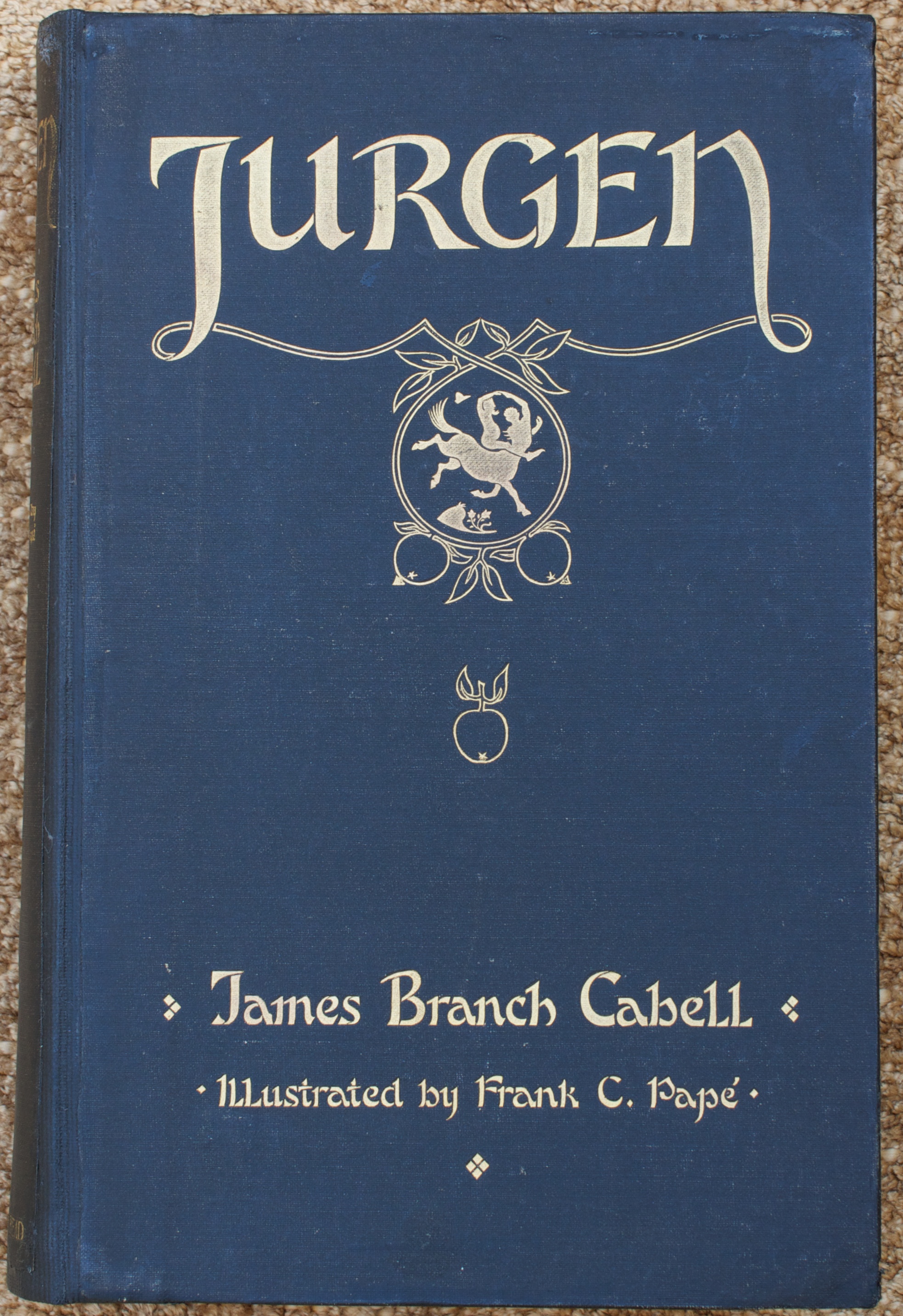I suppose I read it for the first time when I was fourteen or so and then packed it with me through the twenty or so moves since then. The hinges were cracked, there were pen scribbles on some of the pages, and it is missing the frontispiece illustration.(I don’t recall being the one who would commit such desecrations!) But the book has my Nana’s name inscribed in front, wonderful illustrations and endpapers by Frank C. Papé, and all that history, so off to a bindery it was sent for repair. There is not much information on the particulars of this limited first edition but Jurgen was popular enough to go through at least 16 subsequent printings by The Bodley Head. The paper has some foxing but is nicely textured and higher quality than trade books of the ‘20’s. It was printed by Richard Clay & Sons, Ltd., in Bungay, Suffolk.