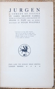 The Whole Book Experience is all about how a particular book might affect me as I read it. Of course the experience is literary. And with the fine and private press books I concentrate on for this blog, it is also sensory. But there are also intangibles like where the book came from, what the story is behind it, or a personal connection somewhere along my forty-five year reading life. These intangibles come to bear in the case of James Branch Cabell’s Jurgen. My mother’s mother, my nana, was kind enough to let her voracious reader and book-loving grandson pick her shelves clean. And on that shelf was 1921 The Bodley Head Limited edition of Jurgen. This is one of my family literary heirlooms.