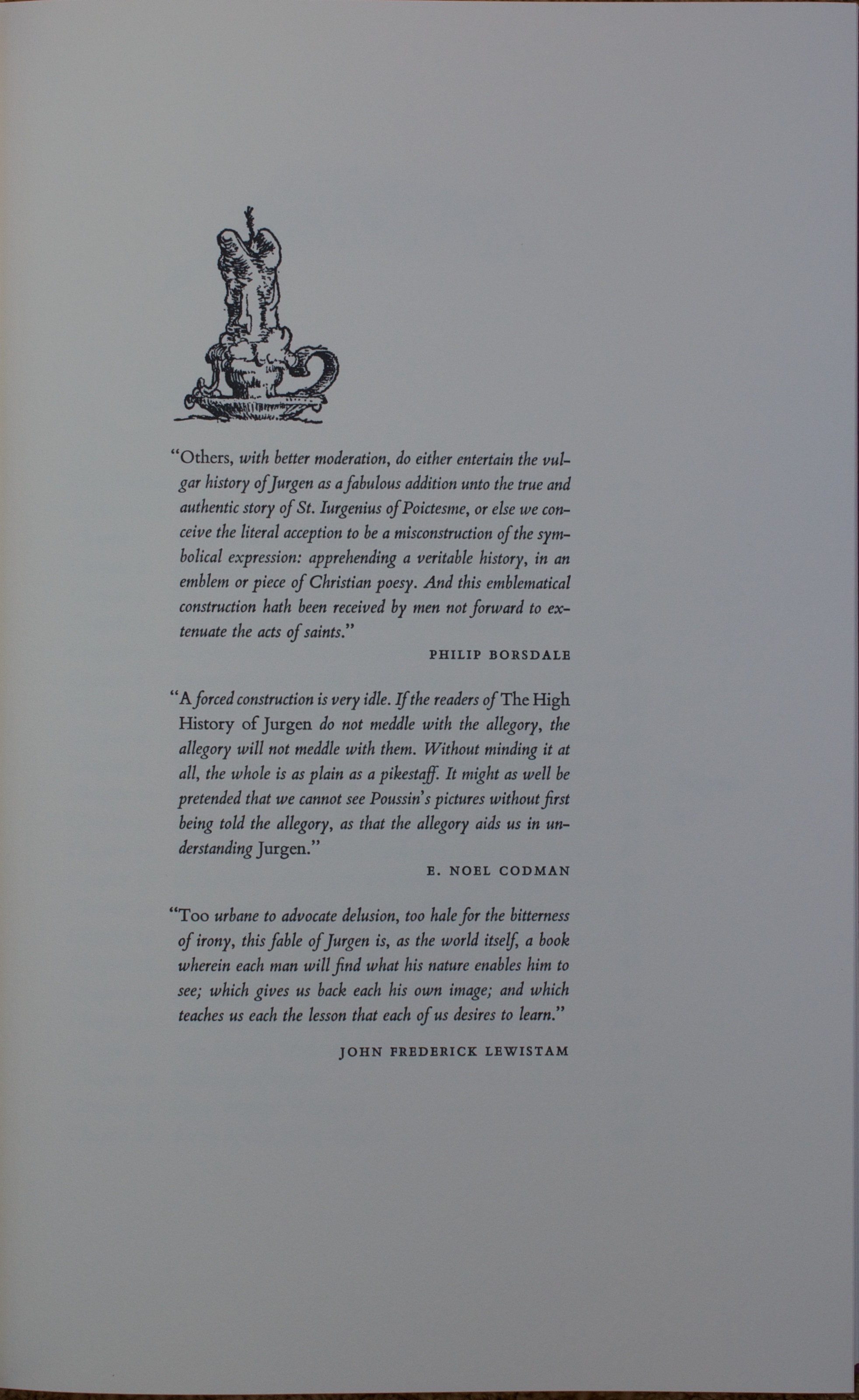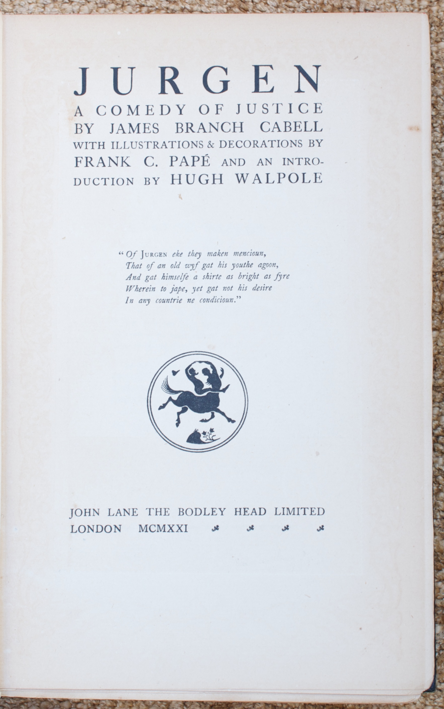 I know no book in the English language that colours one’s imagination and fancy quite as this one does—some more, some less, but none other in quite this way. The world of Jurgen with its grotesquerie, its sudden beauty, its poverty and its pity, its adventure and romance, is a world descended from earlier worlds but unique of its own period.