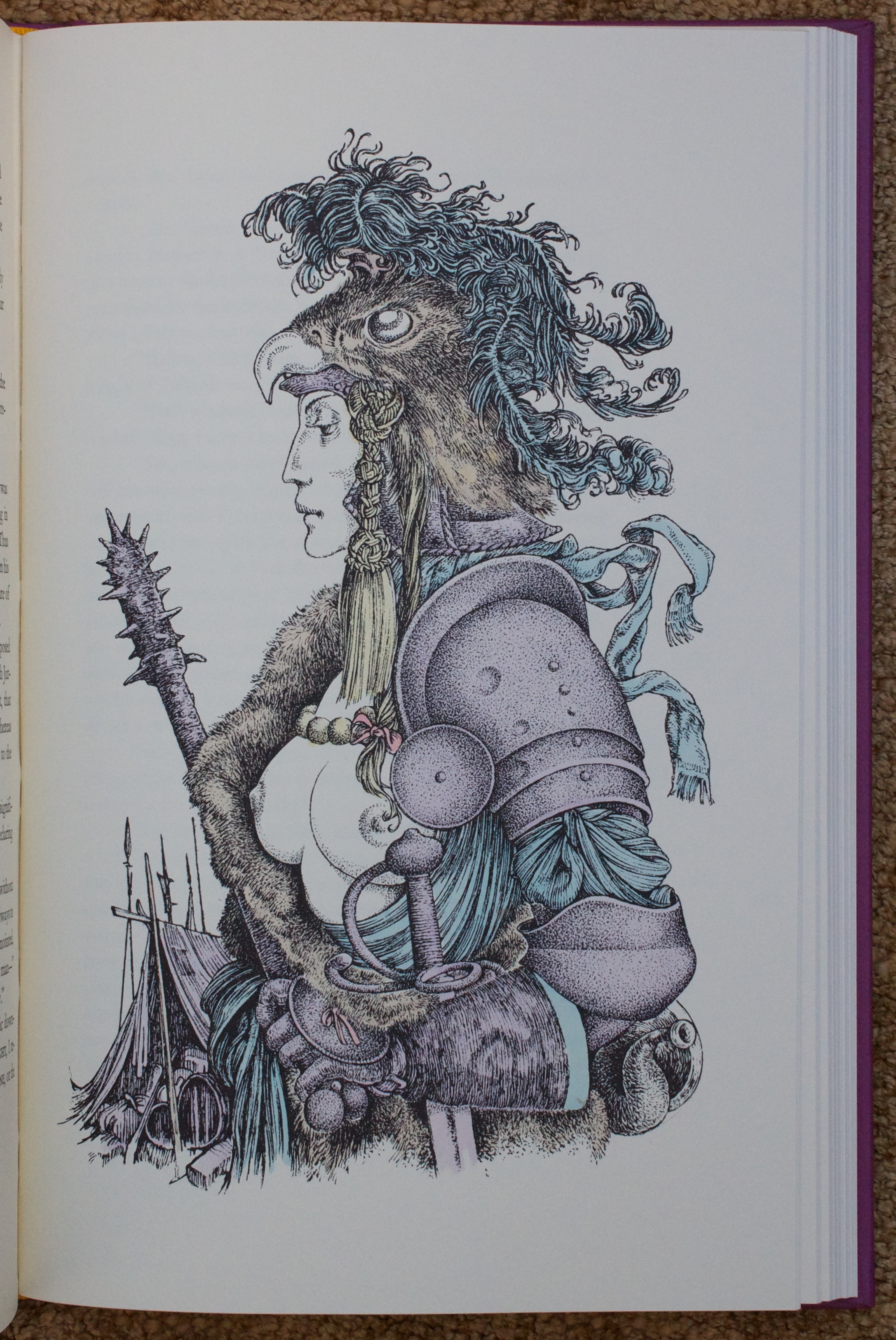 When I discovered that The Limited Editions Club (LEC) published an edition of Jurgen, I naturally wanted to acquire it to see another publisher’s take on the novel and to have a reading edition I could re-visit without worrying about any more damage to Nana’s copy. The LEC edition is a beauty from a time when the publisher was going through a series of owner changes. Just getting a glimpse of the illustrations by Virgil Burnett was enough to accelerate my search for a fine copy. He did a number of decorative black and white drawings that are spread throughout the text and eight wonderful water-colored full-page illustrations.
