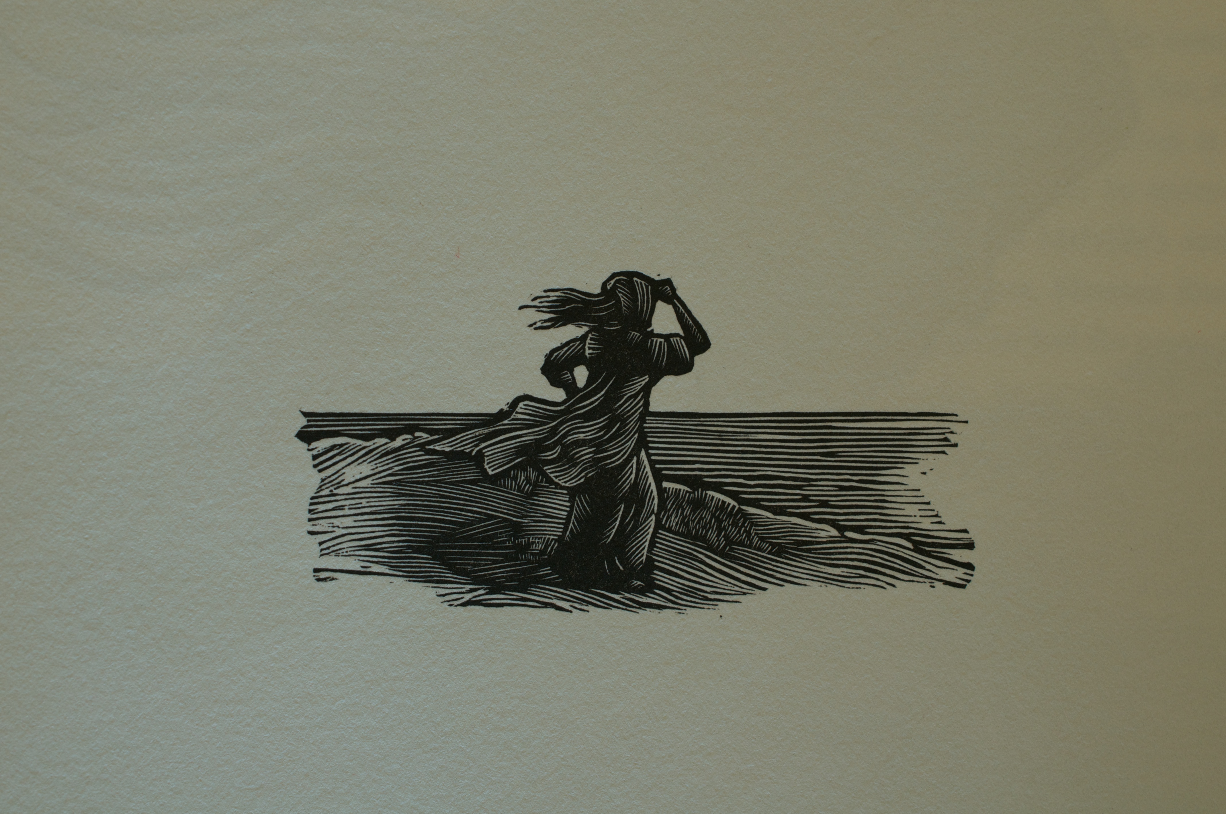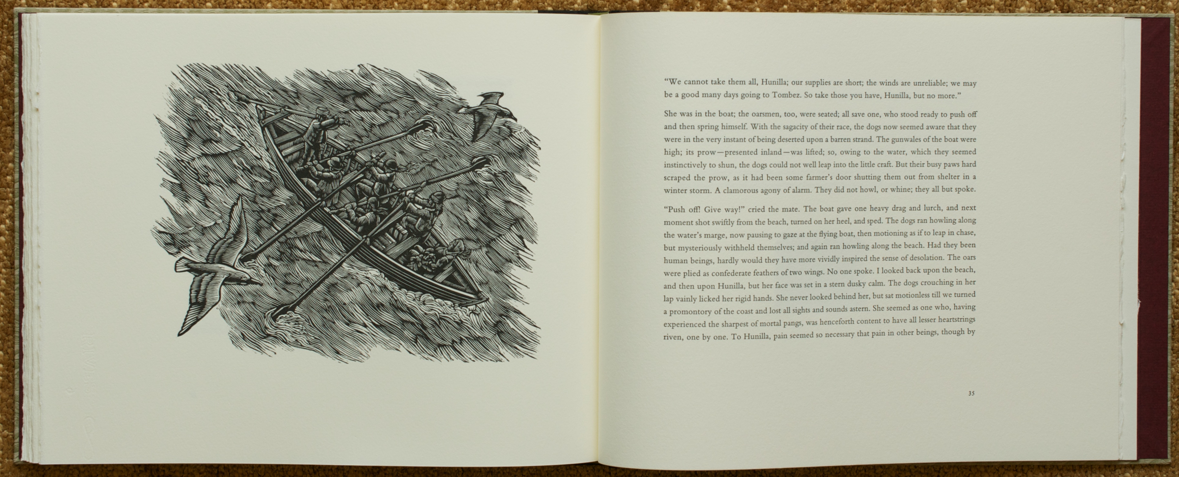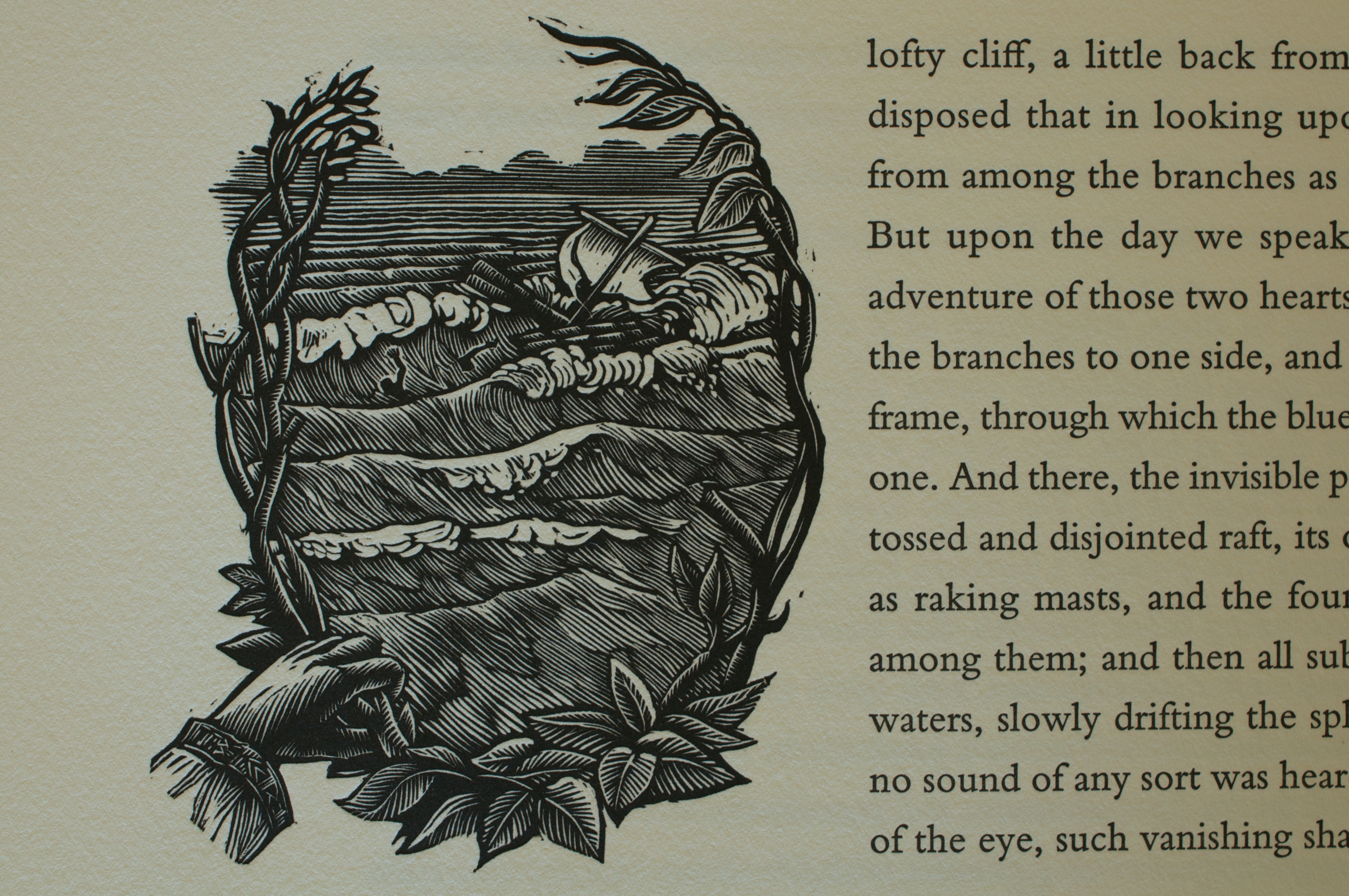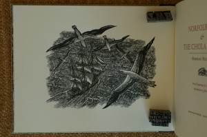 The Chola Widow is one of ten sketches Herman Melville wrote as part of The Encantadas, or Enchanted Isles. As such, it is a short piece that can easily be read in one brief sitting. When a story like this gets the fine press treatment, one gets to enjoy reading all the way through the book, literally enjoying it from cover to cover. The story gets to stand on its own without being stuffed into a collection. The press gets to select illustrations, type, paper, and other design aspects that can heighten the impact of reading the story. David Pascoe of the Nawakum Press has certainly done that here.
