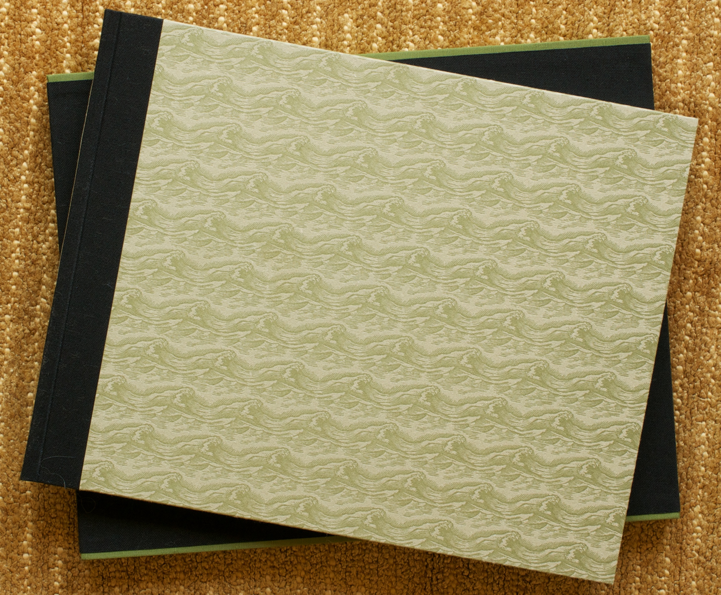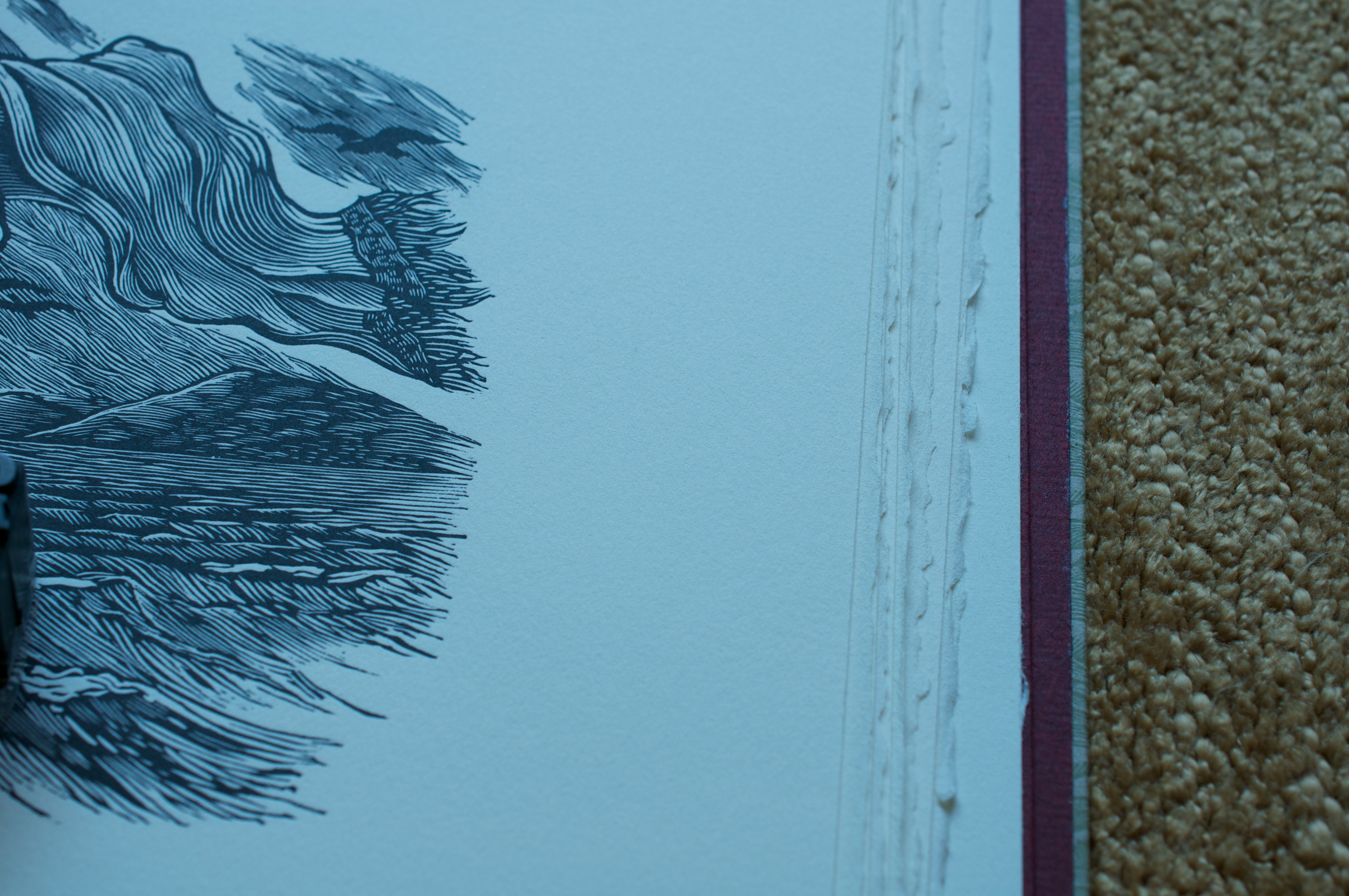 It starts with the patterned paper used to cover the boards; a seemingly endless series of waves rolling across the cover of the book. The spume from the waves rolling constantly into the shoreline of the Encantadas is probably more whitish than the cream of the mould-made Rives Heavyweight paper but the wave theme plays out as the book opens up and the deckle edge of the paper hints of the appearance of the surf-line along the beach.