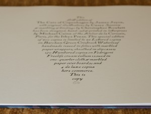discussions of the Joyce Foundation and copyright issues with Joyce’s work. As a lover and reader of all things Joyce, I was happy to be fed another fine press tidbit from the master. Fortuitously, this also led me to a very nice edition of Finnegans Wake by the Houyhnhnm Press. I still await a full fine press treatment of the Wake but am satisfied for now. And I see through the blogroll on the Ithys Press website that The Salvage Press is also exploring some Joycean ideas in their publications.