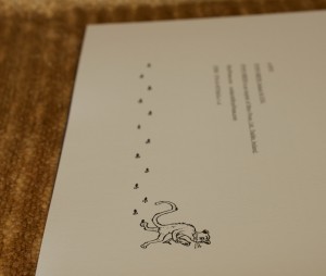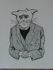 Christopher Rowlatt. I wish I could capture it in photos but it really is a treat to see it in different lighting. The flexible boards used for the cover seem appropriate for a children’s story, although I wouldn’t want a child handling this book unsupervised, of course. Casey Sorrow’s illustrations are appropriately playful. I especially like his sketch of Joyce out for a walk with a smuggled cat in his suitcase and the pensive cat closing out the story and asking the reader “What do you think of this?” I think it’s nice to see this story see the light of day after so many years.