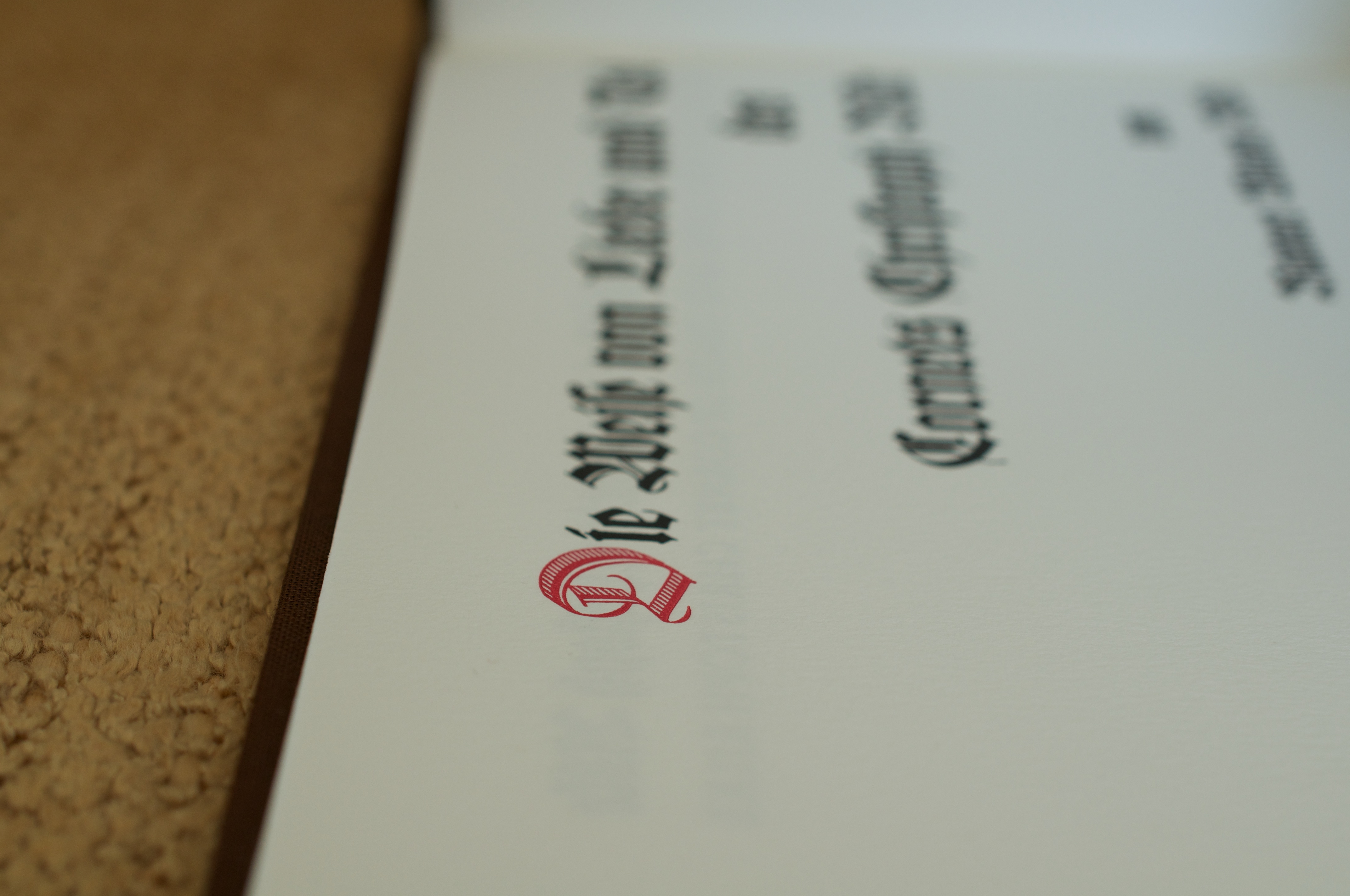 The Arion Press edition was published in 1983 and is a great example of early output from the press. This is a very handsome edition. The Wilhelm Klingspor Schrift and Zierschrift type for the German text on the verso pages seems perfect for the masculinity of the German language and the subject matter. The English on the recto pages is in Trajanus Antiqua and sits well next to the heavier type used for the German. The use of red ink for the initial capitals is a nice touch that I always appreciate in book design. The smell of the T. H. Saunders mouldmade paper is still there 30 years after publishing. Does that wonderful smell ever go away? I hope not.