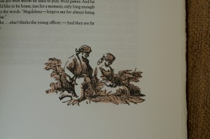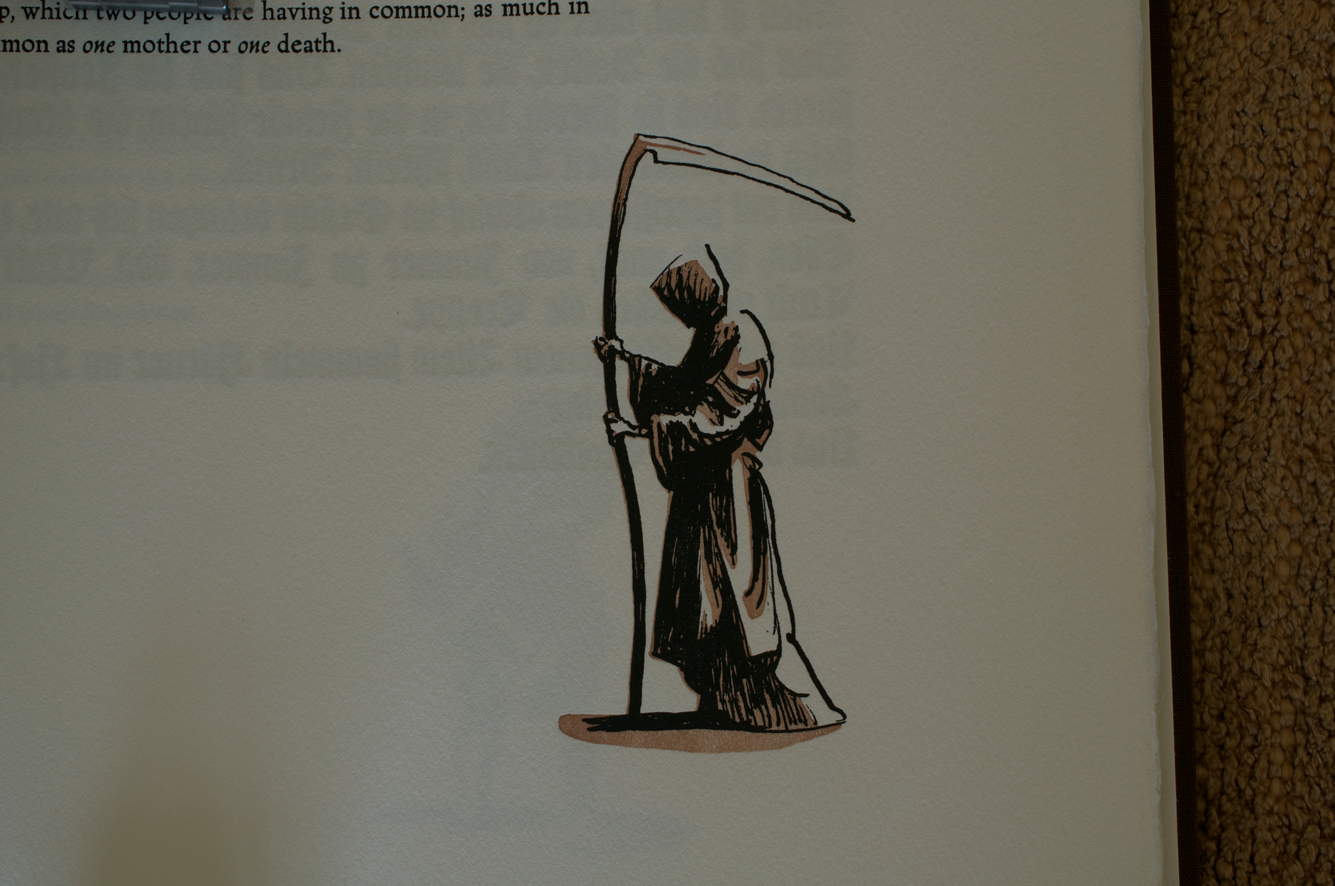 only because I have one other book illustrated by him, a poetry anthology that has similar but equally fitting illustrations. The illustrations here were done in brown and black, adding a third color to the red of the initials. The colors create a nice balance on the page with the brown of the illustrations tying in nicely to the brown cloth used on the cover.