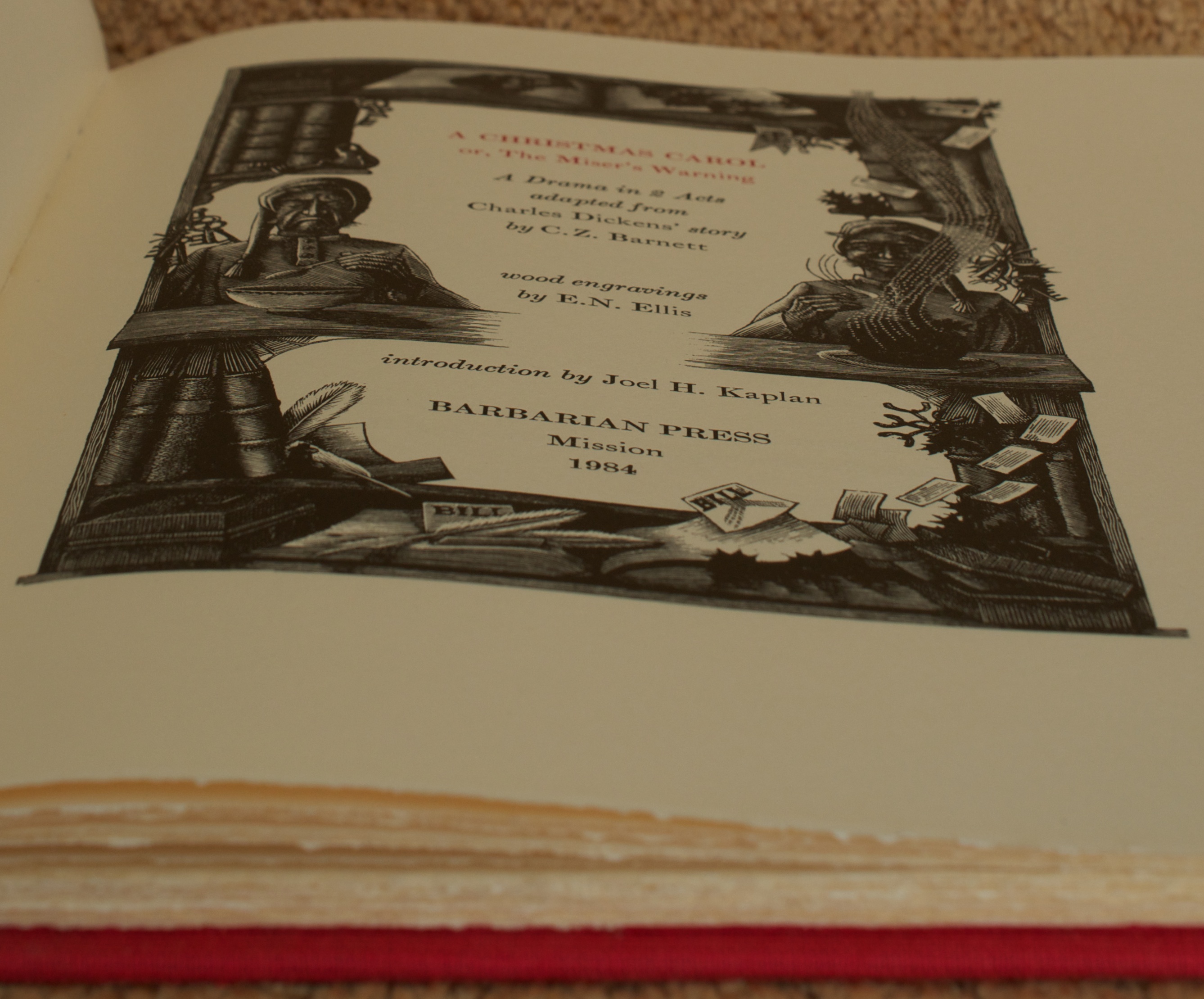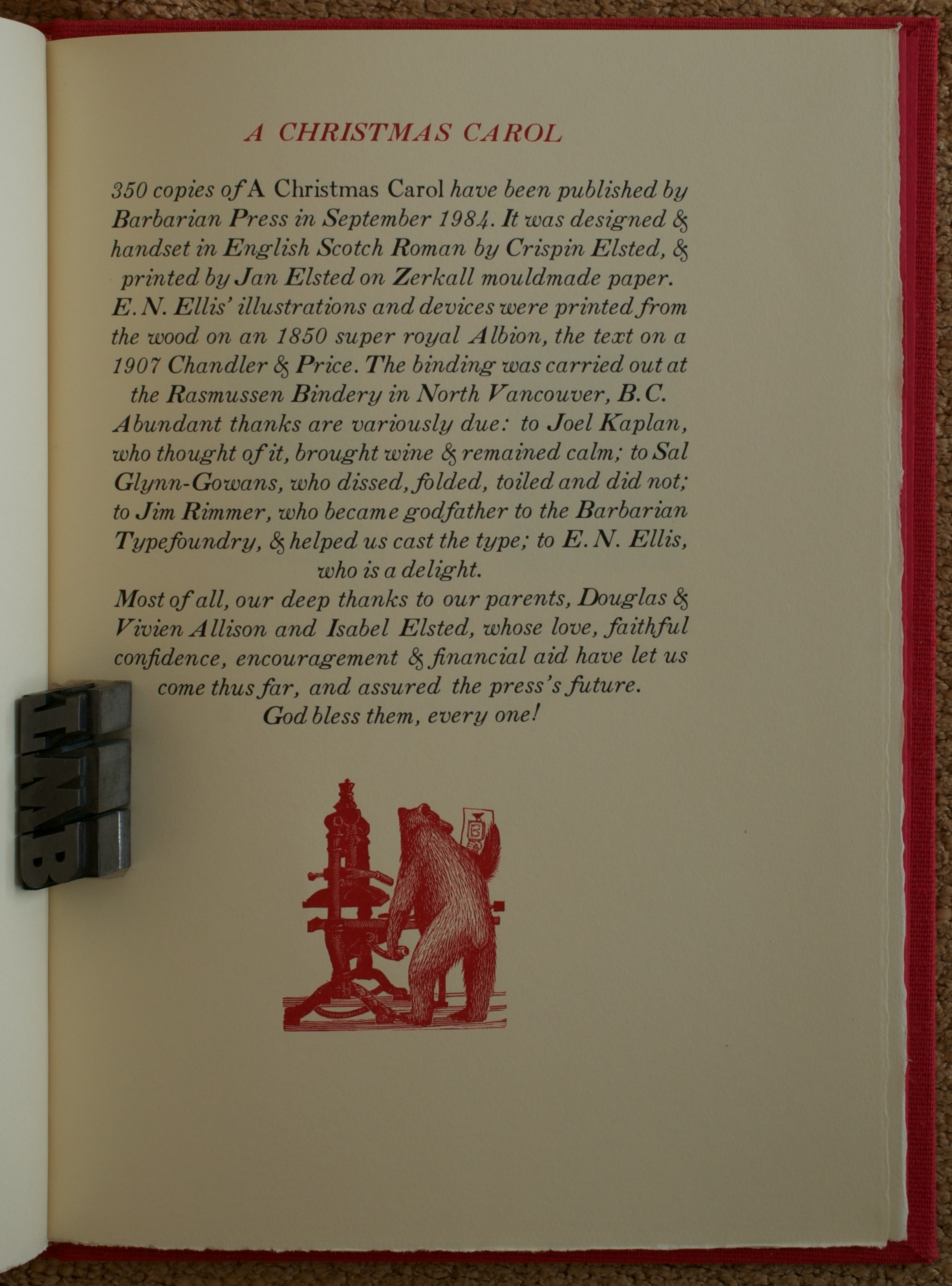 For this year’s Christmas book, I finish up with the last of the three Christmas-themed books published by the Barbarian Press. It’s fitting that the last is also the first in many respects. It was the first Christmas book that the press printed, and the tenth book overall, when it was published in 1984. It was also the first time they were to publish a book with illustrations. According to Hoi Barbaroi: A Quarter Century at the Barbarian Press, “the most important result of working with engravings was JE’s discovery of her affinity for printing them.” Finally, it was also the first time that Crispin cast type for a Barbarian Press book. Jim Rimmer of the Pie Tree Press & Typefoundry taught him to cast type and he was hooked. They bought the Monotype Sorts Caster from Rimmer and were off and running down another of printing’s many fascinating twists and turns.