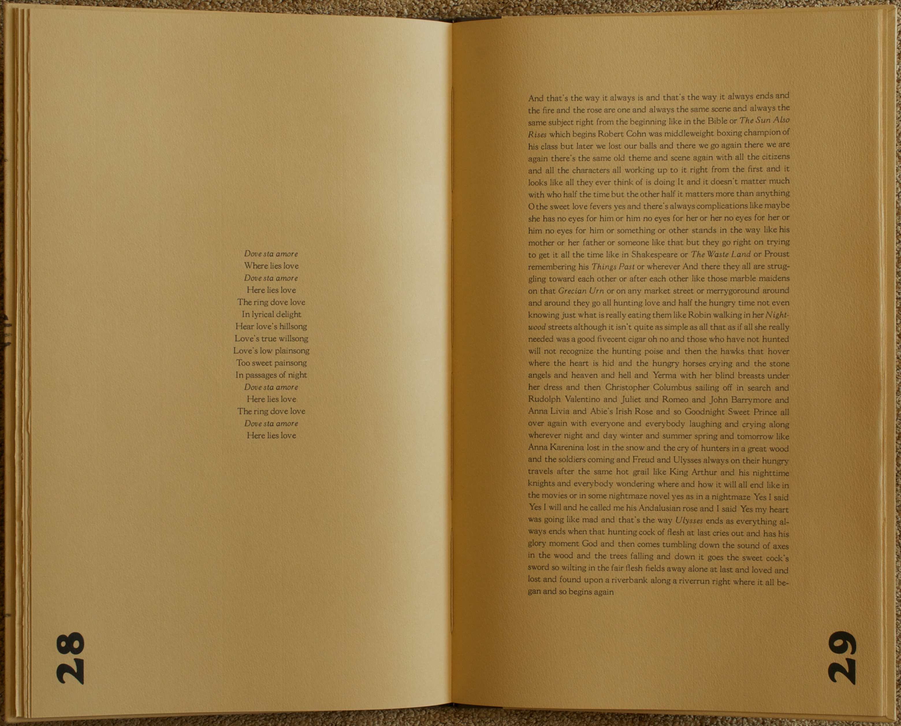 “…and everyone wondering where and how it will all end like in the movies or in some nightmaze novel yes as in a nightmaze Yes I said Yes I will and he called me his Andalusian rose and I said Yes my heart was going like mad and that’s the way Ulysses ends as everything always ends when that hunting cock of flesh at last cries out and has his glory moment God and then comes tumbling down the sound of axes in the wood and the trees falling and down it goes the sweet cock’s sword so wilting in the fair flesh fields away alone at last and loved and lost and found upon a riverbank along a riverrun right where it all began and so begins again”