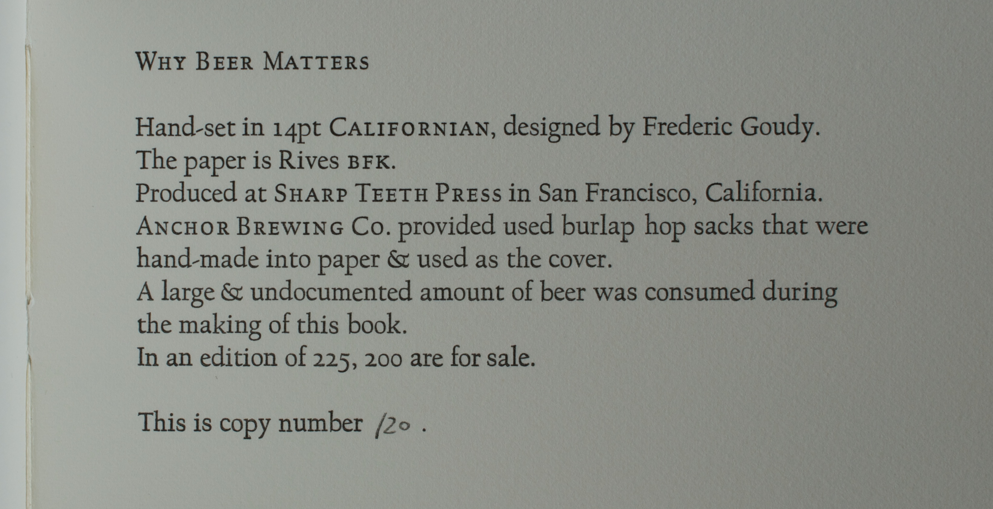 So it was with positive delight that I got a chance to review Sharp Teeth Press’ edition of Evan Rail’s Why Beer Matters. Seeing an essay that would be at home in a recent issue of Zymurgy but also has broad appeal to anyone interested in food given the fine press treatment is indeed a pleasure. And it looks like David Johnston had a bit of fun printing it as the colophon states “A large & undocumented amount of beer was consumed during the making of this book.” Even Anchor Brewing Company got in on it by providing burlap hop sacks that were used to make the hand-made paper for the cover. I would not be surprised that an ad for this book in Zymurgy would quickly send it out of print.