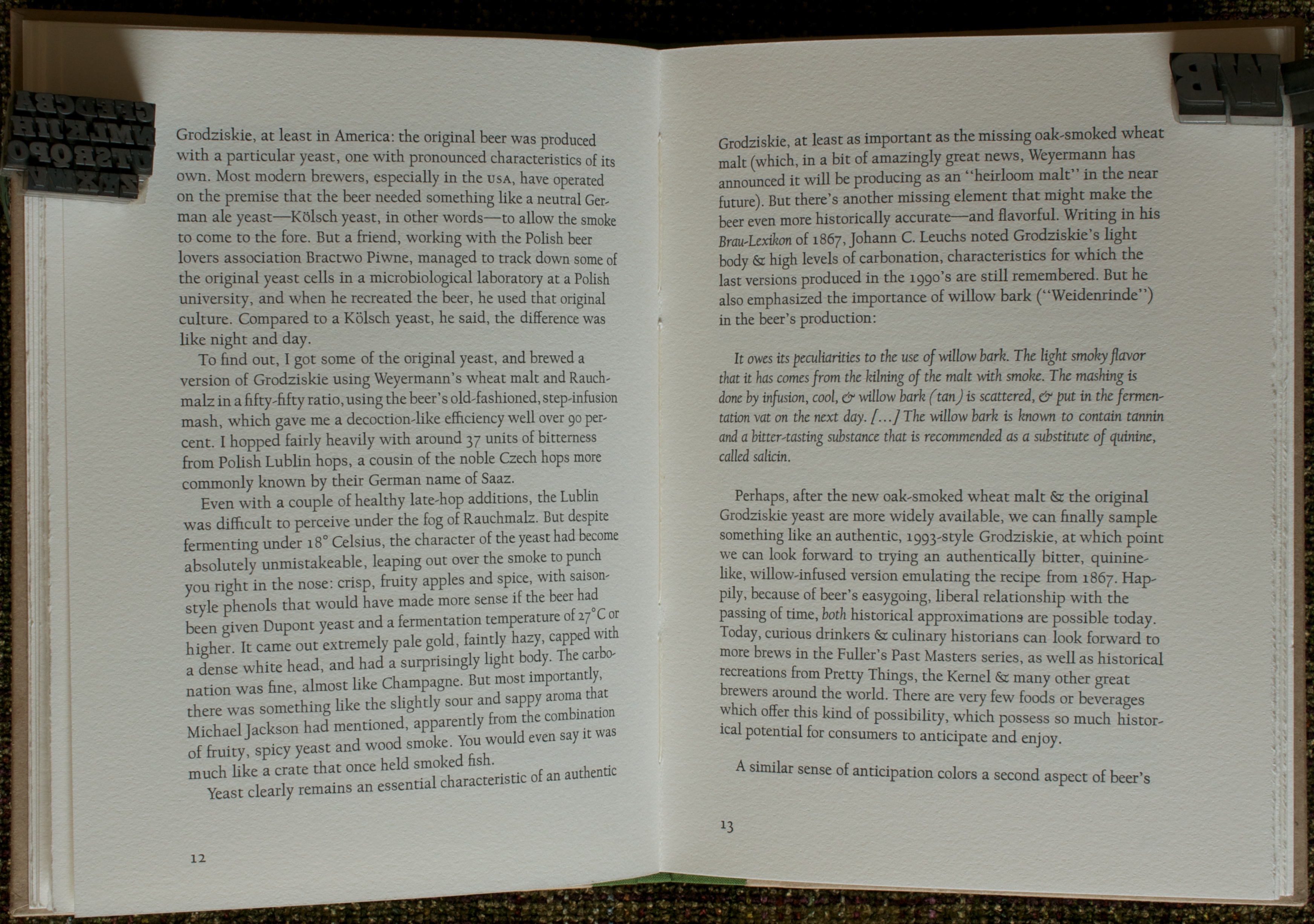 demonstrating that it lacks the sense of terroir that wine, tea, and some other beverages can exhibit. Finally, he talks about the uniquely democratic characteristics of beer’s cost and egalitarianism. It’s enough to make one want to throw the book in a carry-on (carefully, of course, it’s fine press) and head to Munich for the Starkbierzeit or to Prague to visit what may be the oldest brewpub in the world, U Fleku.