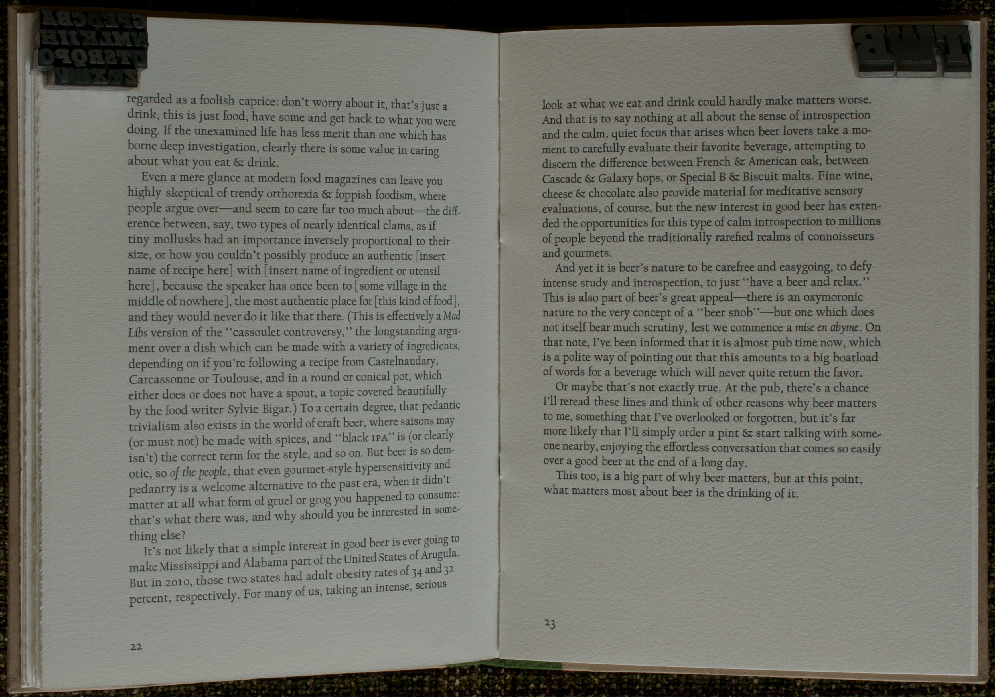 There are a couple of very nice touches in the design of this book above and beyond the aforementioned clever use of hop sacks. Similar to the previously reviewed edition of Thoreau’s Civil Disobedience from Sharp Teeth, the border between the cover paper and the quarter-binding of cloth is irregular, which I find striking. The hop plant seemingly growing out of the corner of the front cover adds a nice tie-in to the finishing ingredient in beer. The Rives BFK paper has a nice tactile feel and enough thickness to allow the handset Californian type to bite nicely into the paper without being so thick as to feel stiff.