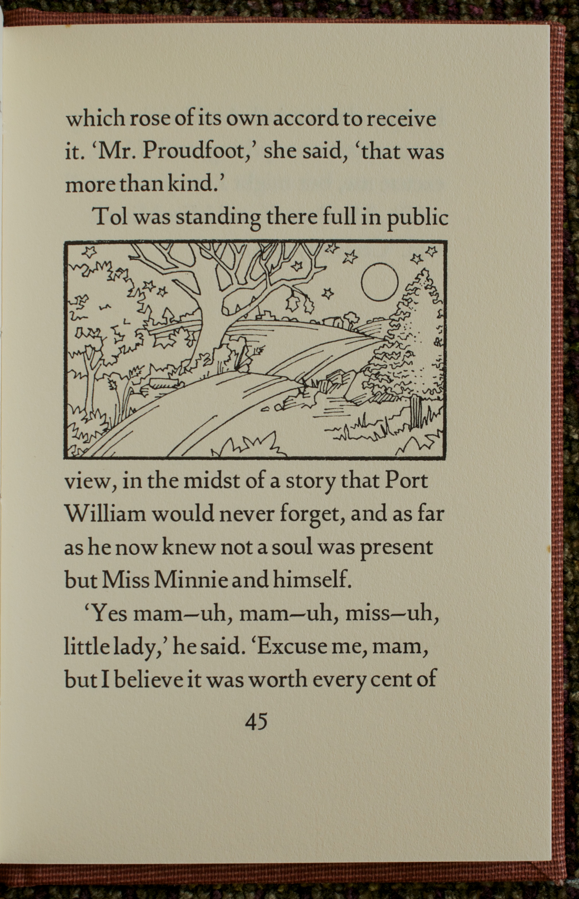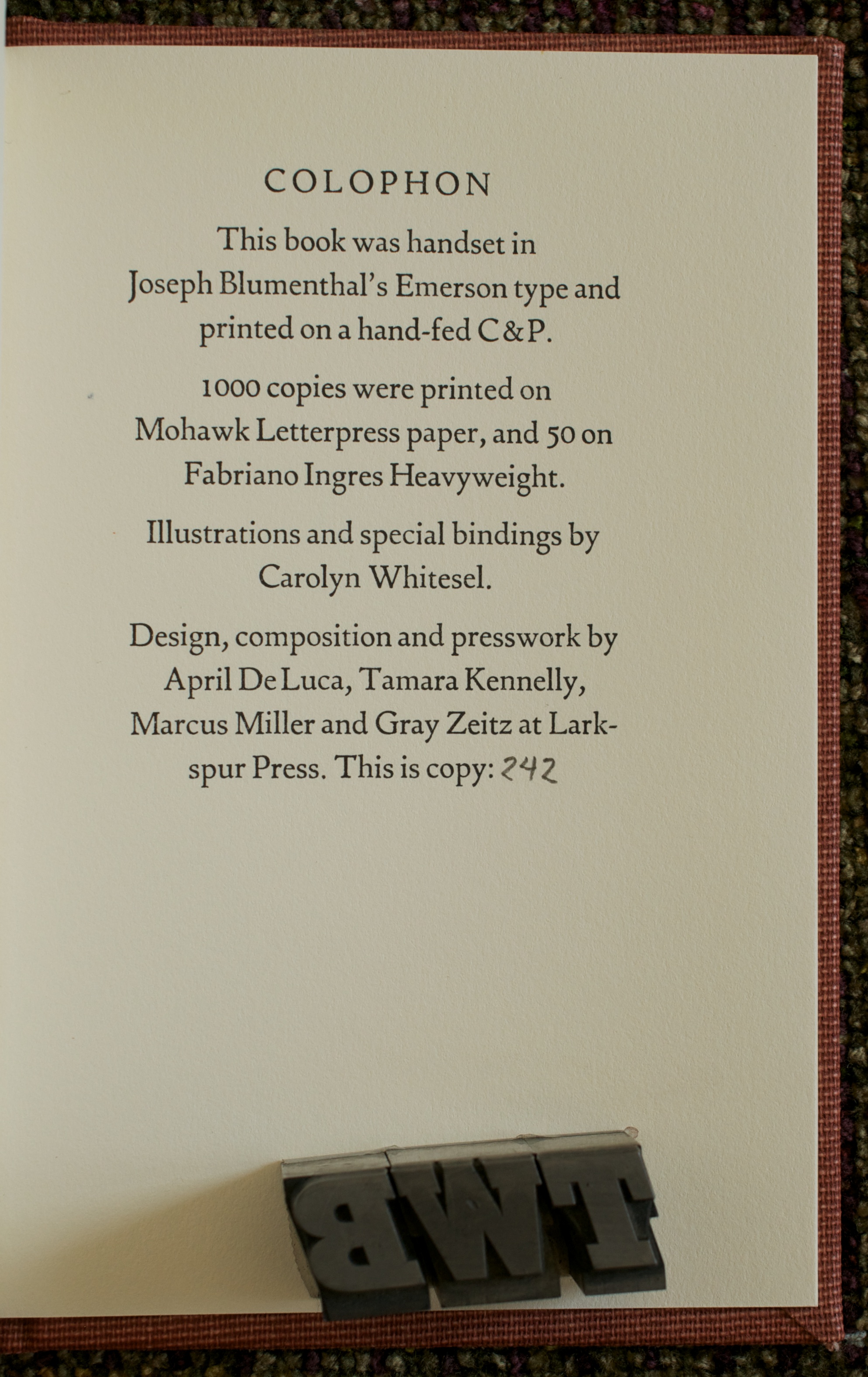 jacket in two colors with two of Carolyn Whitsel’s illustrations that also appear in the book itself printed on the front and back. The paper is Mohawk Letterpress. The book was handset and printed on a handfed C&P press, which I believe is standard method of operation for Larkspur books, and then sewn and handbound into it’s case. This is a beautiful book that fits easily in the hand and is a pleasure to read over and over again.