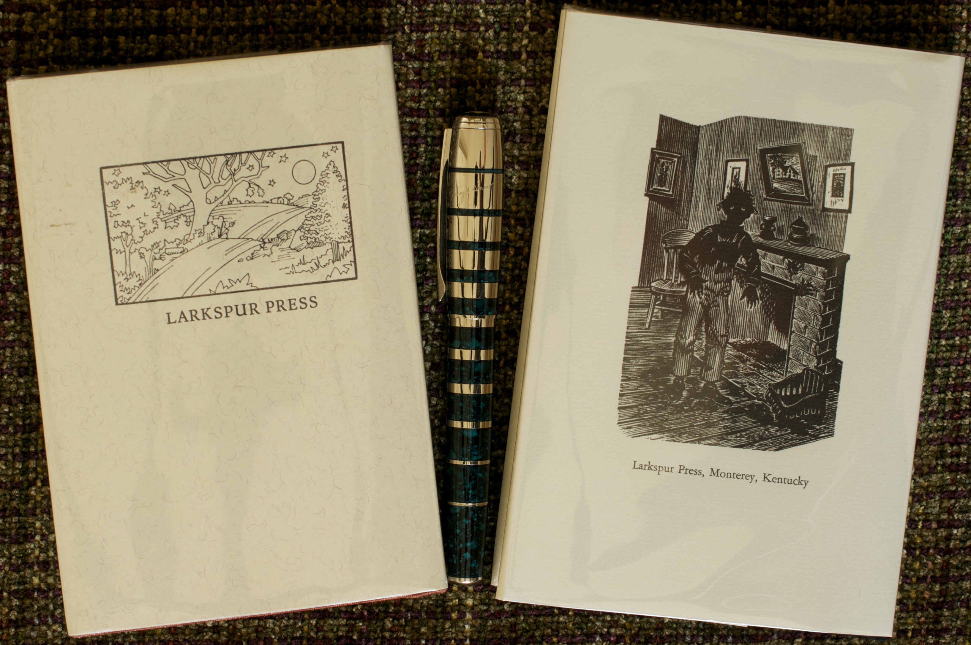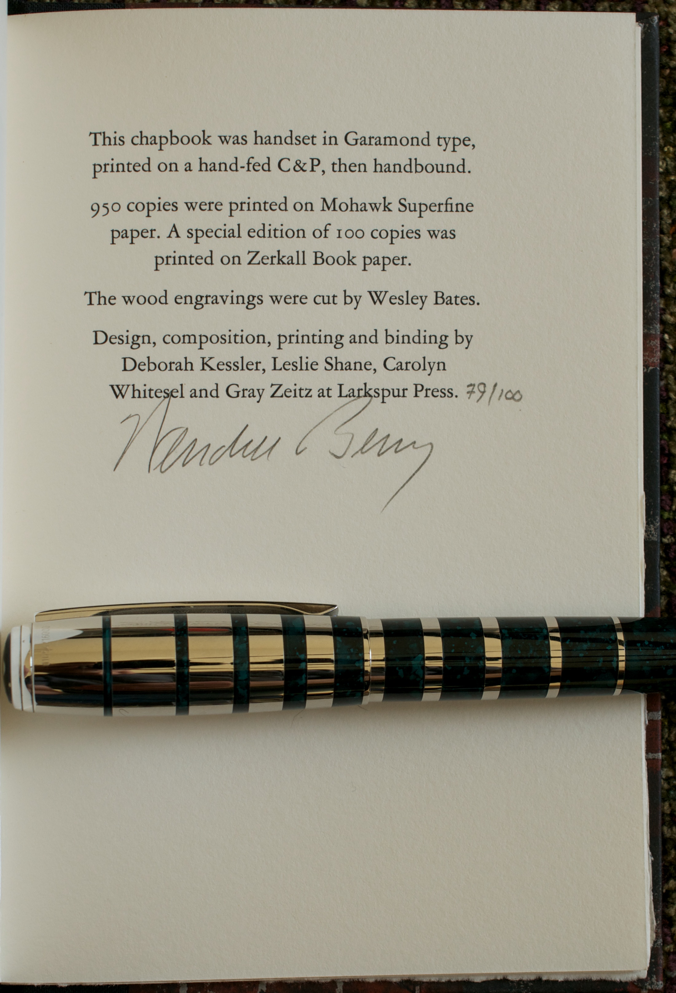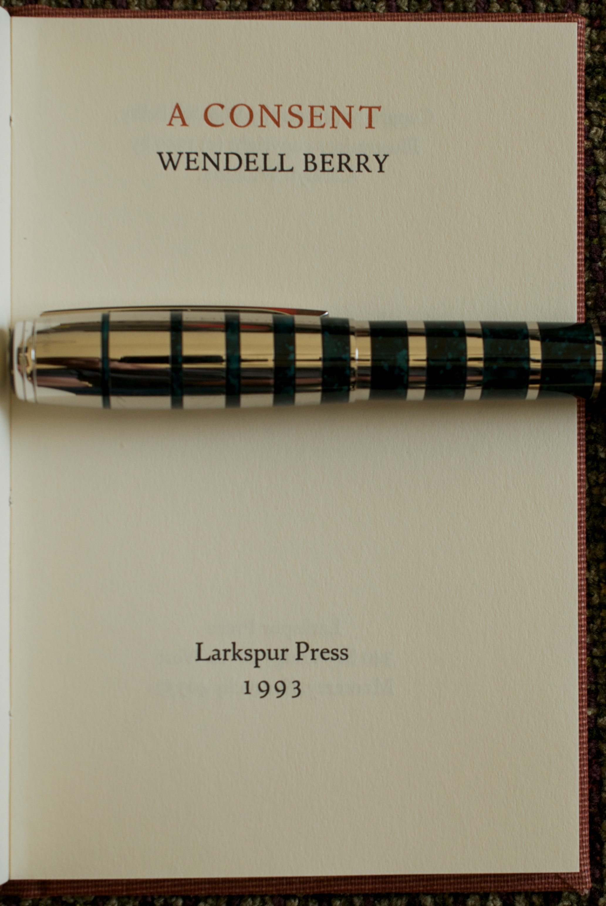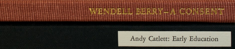 On a recent visit to San Francisco I was shocked to find a couple Larkspur Press editions at Green Apple Books. It was the first time I’ve run across Larkspur press editions at a bookseller. I picked up the cloth hard back state of A Consent without batting an eye to add to my special state of Andy Catlett: Early Education. I’m a sucker for any fine press edition of Wendell Berry’s work as I admire him immensely as a writer, a poet, an agrarian activist, and a farmer.