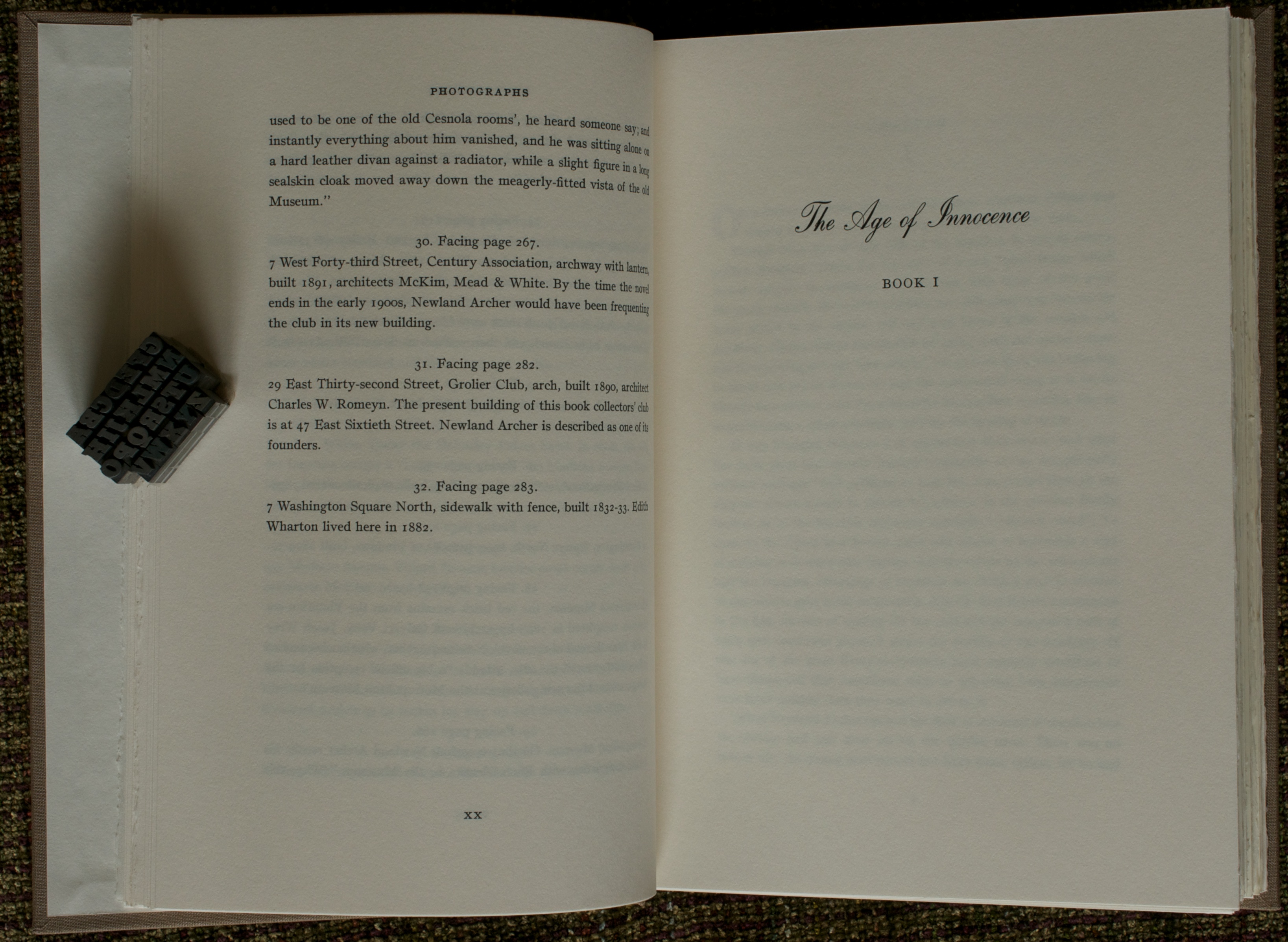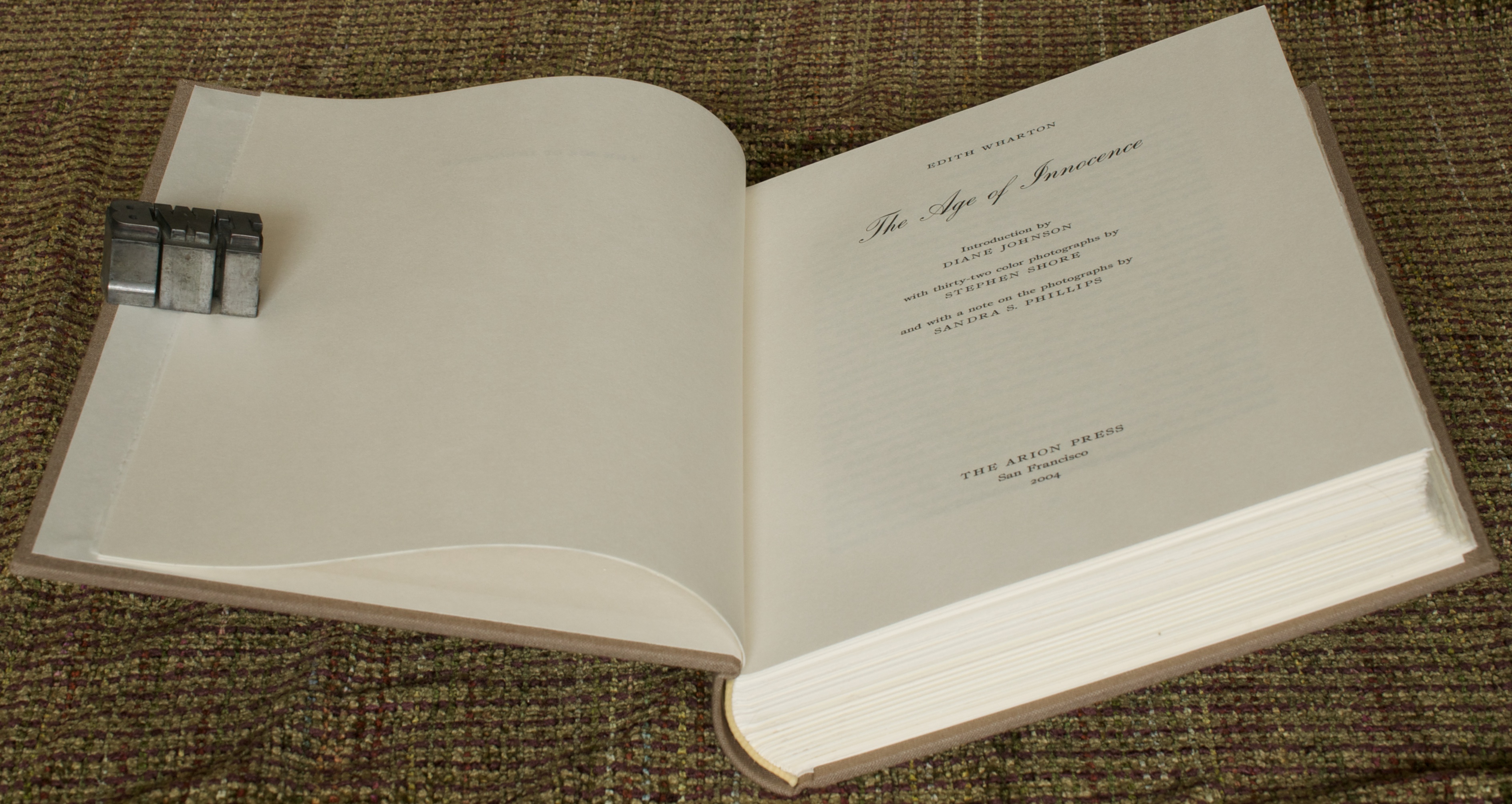 Be that as it may, Edith Wharton has been treated better than almost any other woman besides Jane Austen by the fine presses over the years. In addition to the 2004 Arion Press edition of The Age of Innocence I am reviewing here, this work by Wharton was published by the Limited Editions Club thirty years earlier. That the LEC published this most popular book of Wharton’s is not surprising. I mention it here mainly because this particular Arion Press edition reminds me of many of the LEC books with their classic, simple, and clean designs.
