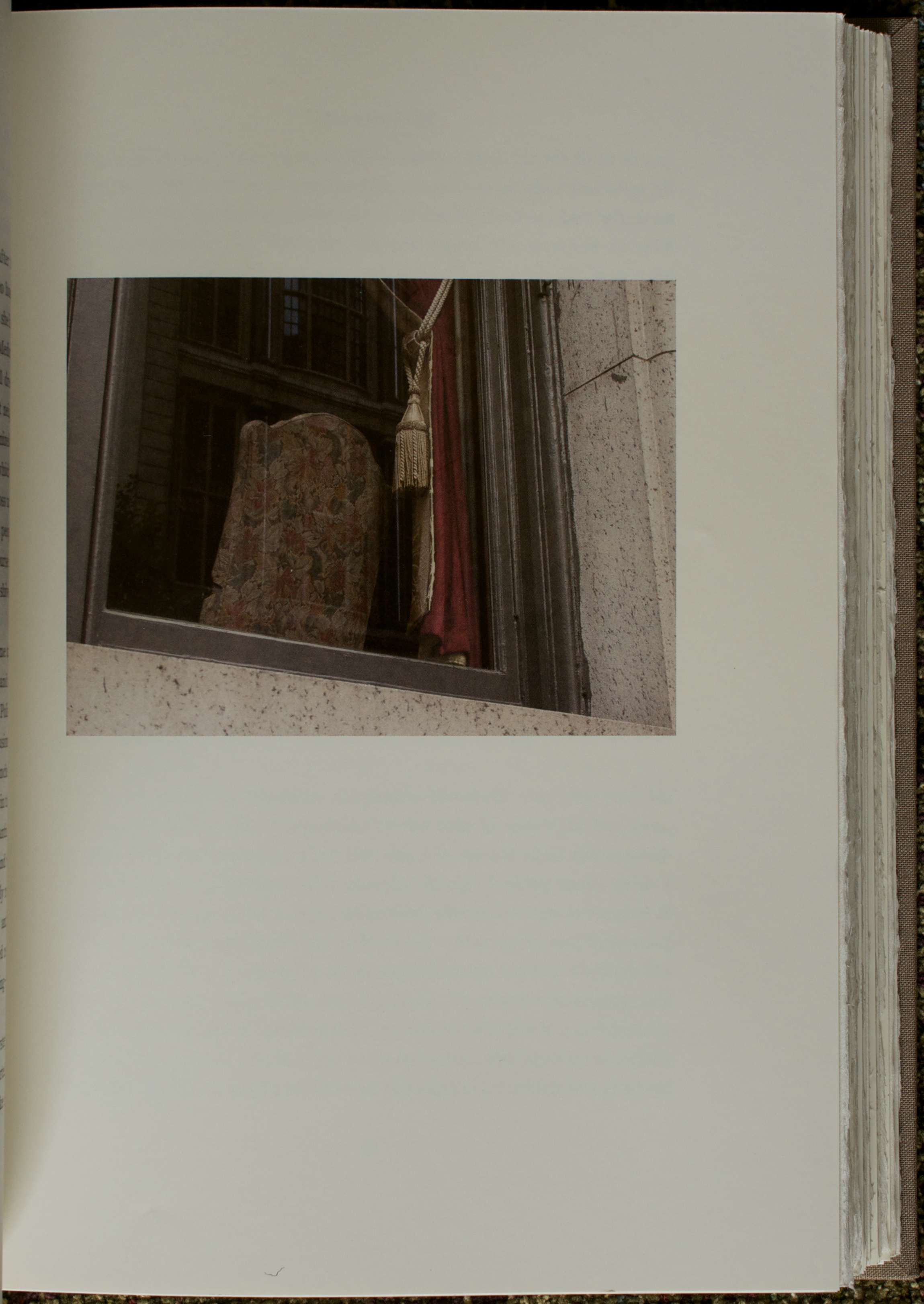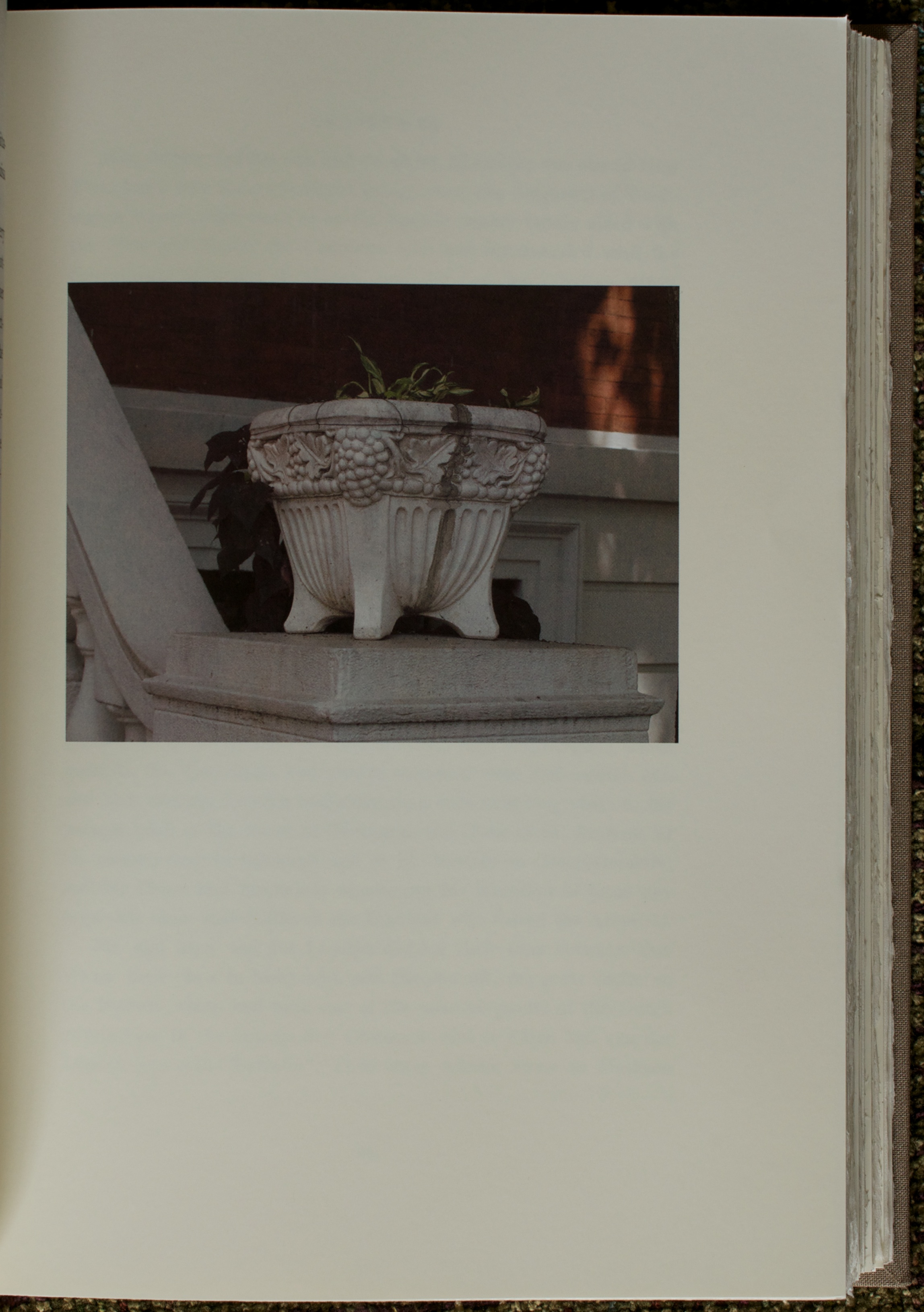 The design starts with a simple and elegant full cloth binding whose color is reminiscent of the brownstone houses lived in by many of the characters that inhabit the novel. The spine label is superb with gold stamped lettering and a small photograph of an urn. The spine is classically rounded with the textblock of all cotton mouldmade Velata paper from Italy’s Magnani mill mimicking the rounded spine on the fore-edge. The paper smells marvelous every time the book is opened. The Potlatch Vintage paper was chosen to highlight Stephen Shore’s photographs while matching the tone of the Velata. Another nice touch.