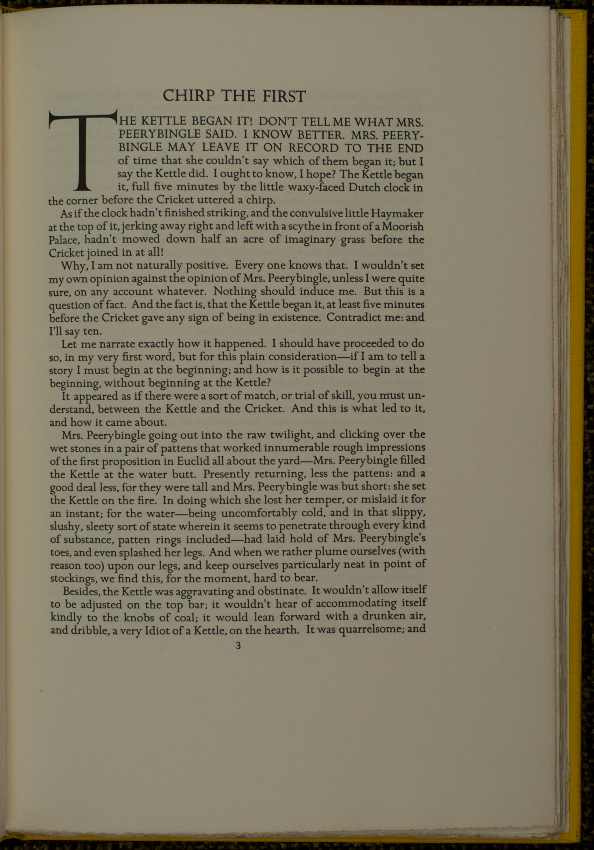 For all the Cricket Tribe are potent Spirits, even though the people who hold converse with them do not know it (which is frequently the case); and there are not in the Unseen World, Voices more gentle and more true; that may be so implicitly relied on, or that are so certain to give none but tenderest counsel; as the Voices in which the Spirits of the Fireside and the Hearth, address themselves to human kind.