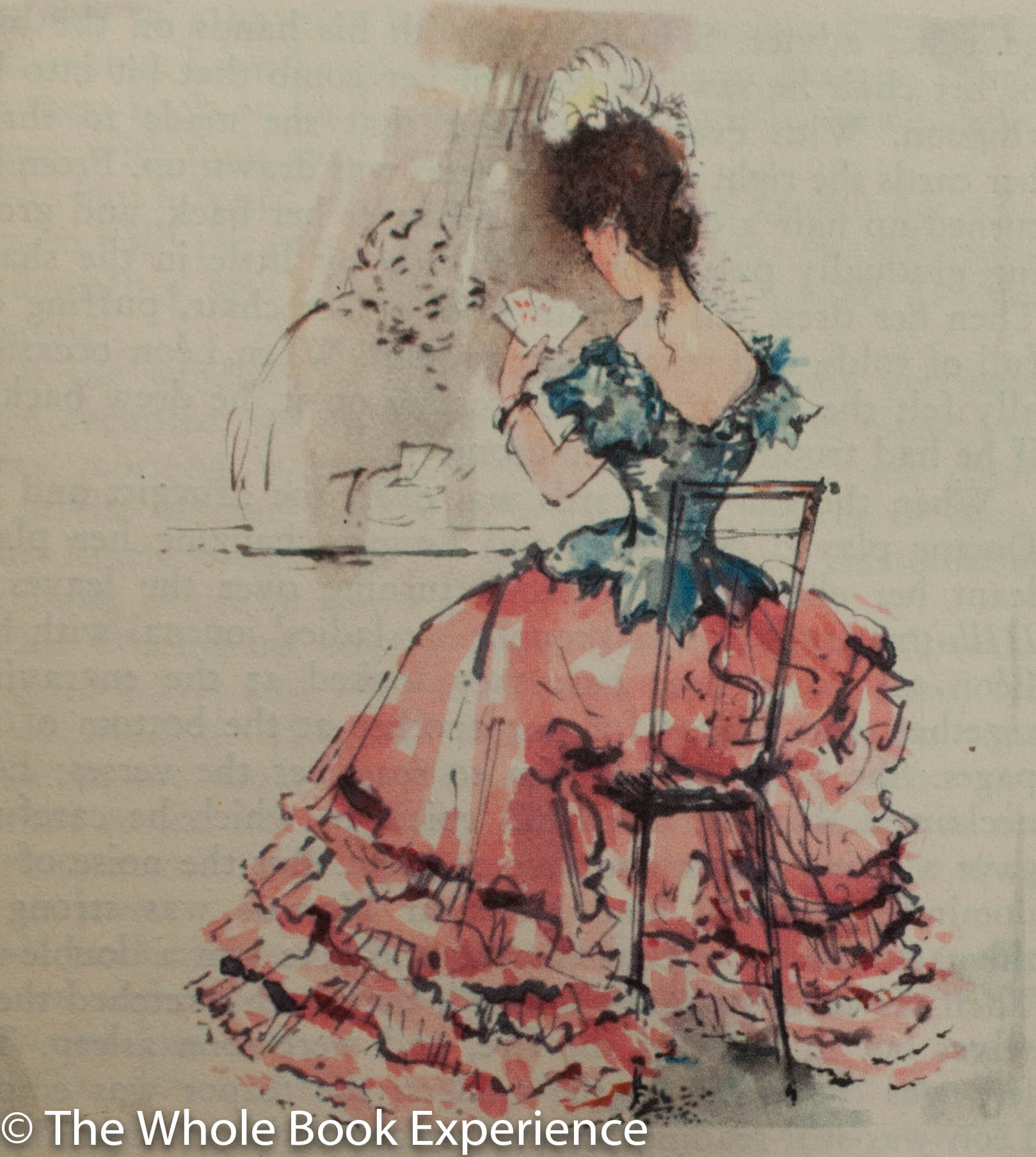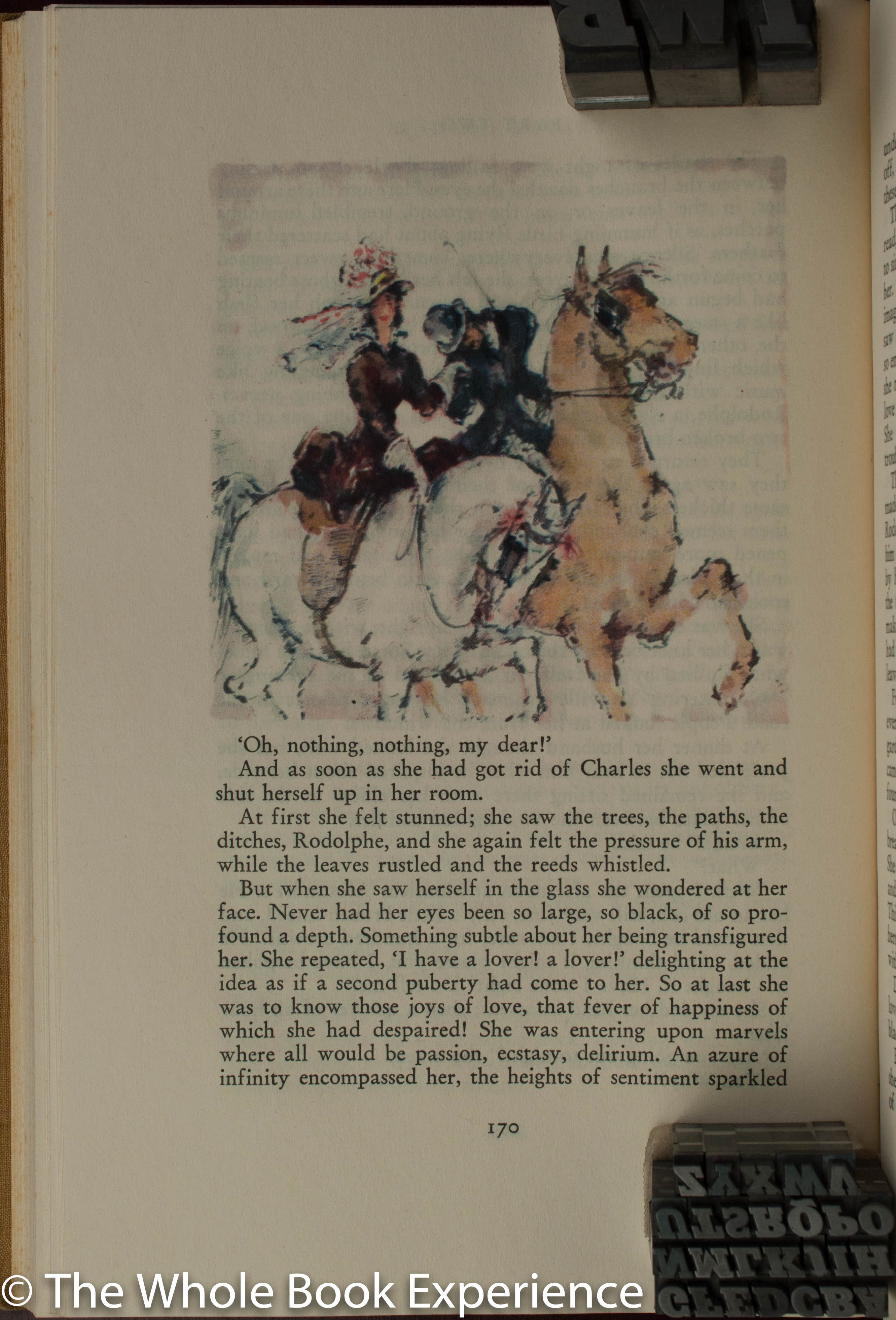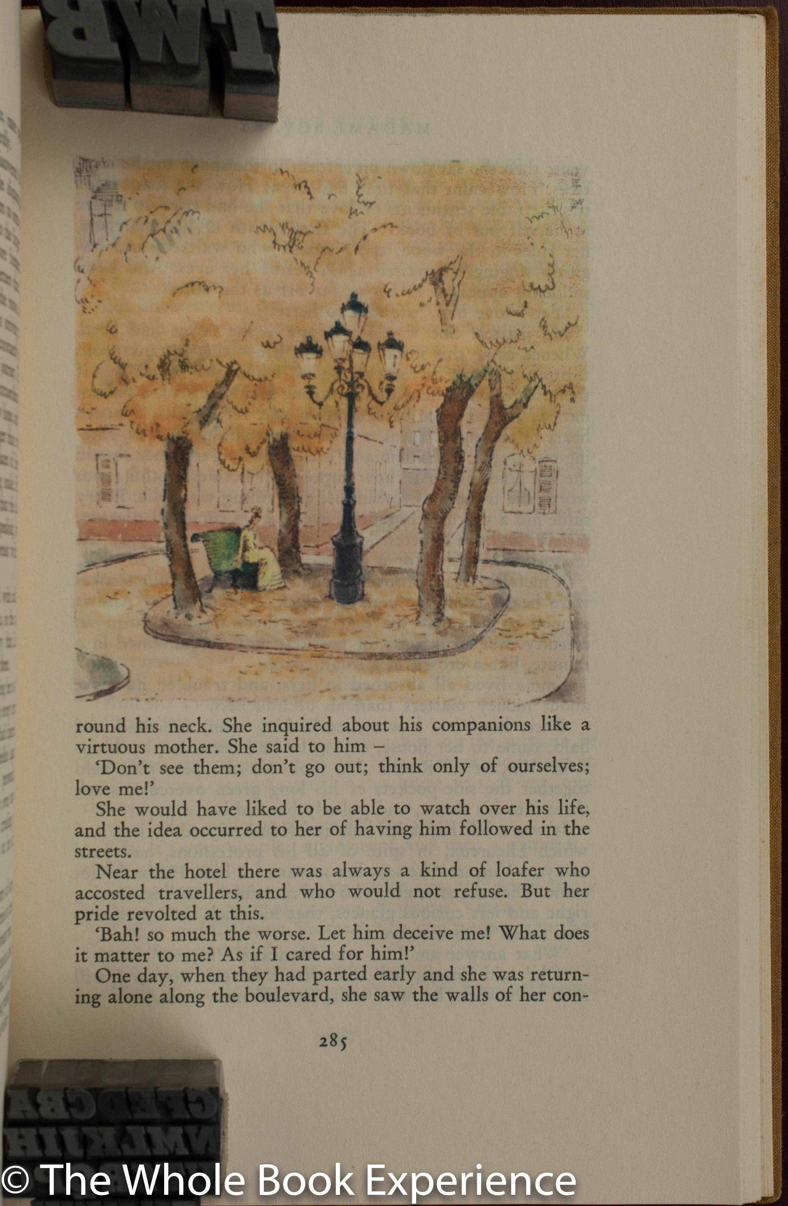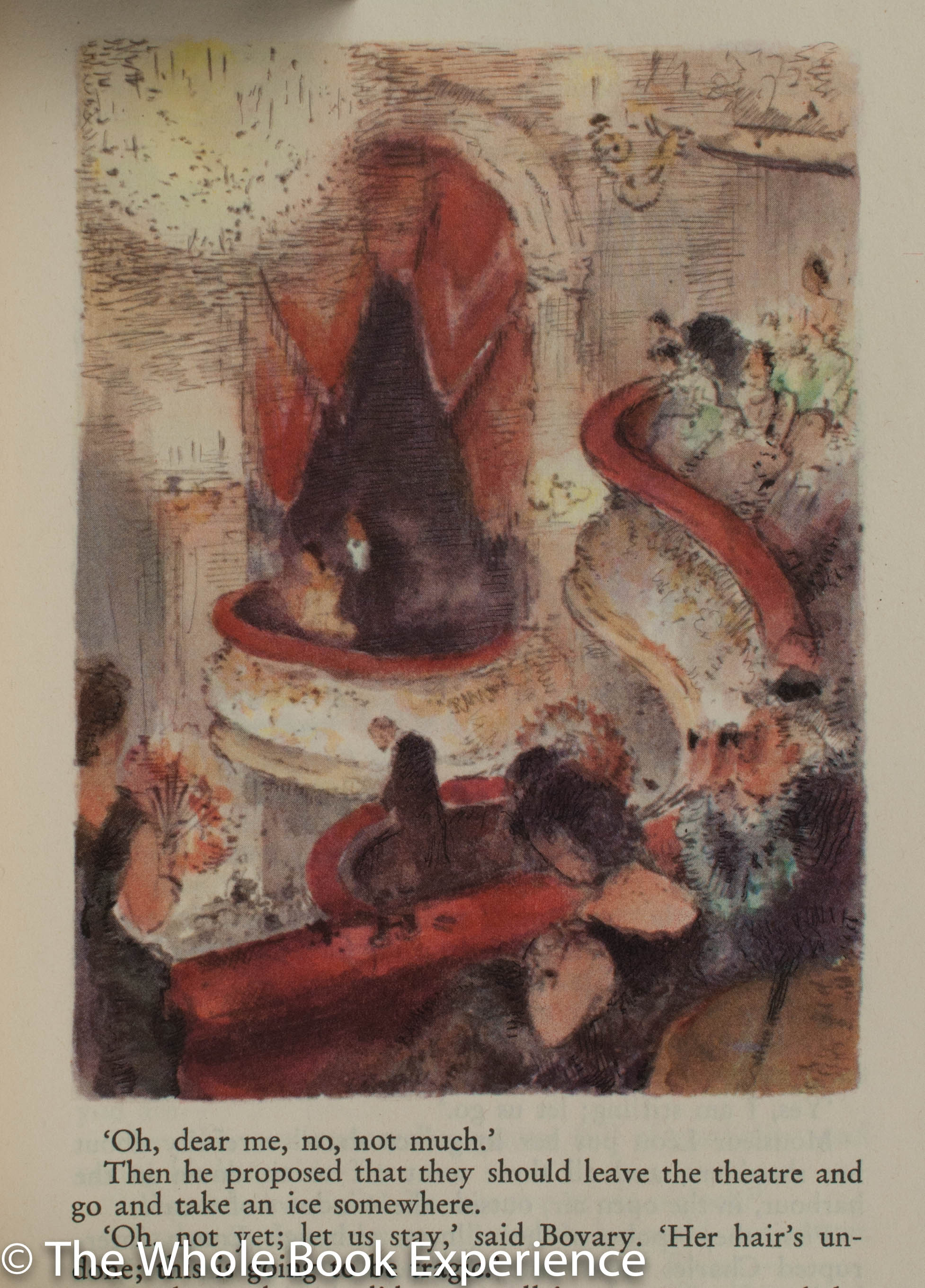 eye for Emma. While all of the approximately 50 illustrations are wonderful, Böhmer does an amazing job of capturing the emotion of various scenes in Emma’s face, with the Swiss design team at Fretz Freres doing a masterful job of placing them in appropriate places to support the text. The landscapes and scenes from the book are equally captivating and beautifully colored throughout. In the Monthy Letter, it is stated that they unsuccessfully tried various methods of reproduction for Böhmer’s art before they settled on chromolithography in up to nine colours. It seems they chose wisely as the illustrations so perfectly fit the scene and mood of the various passages of the book whether in bright gaily happy instances or the dark somber happenings. Indeed the color palette seems to darken appropriately as the reader approaches the tragic end.