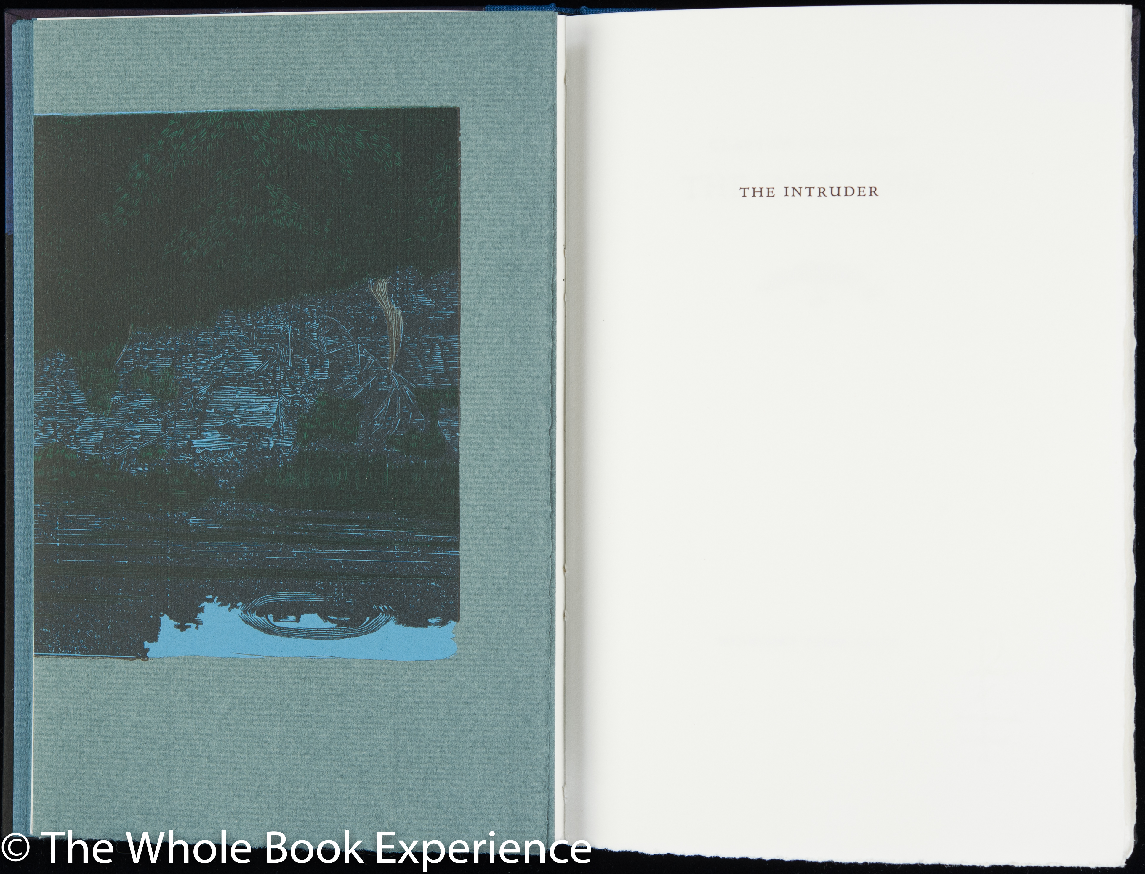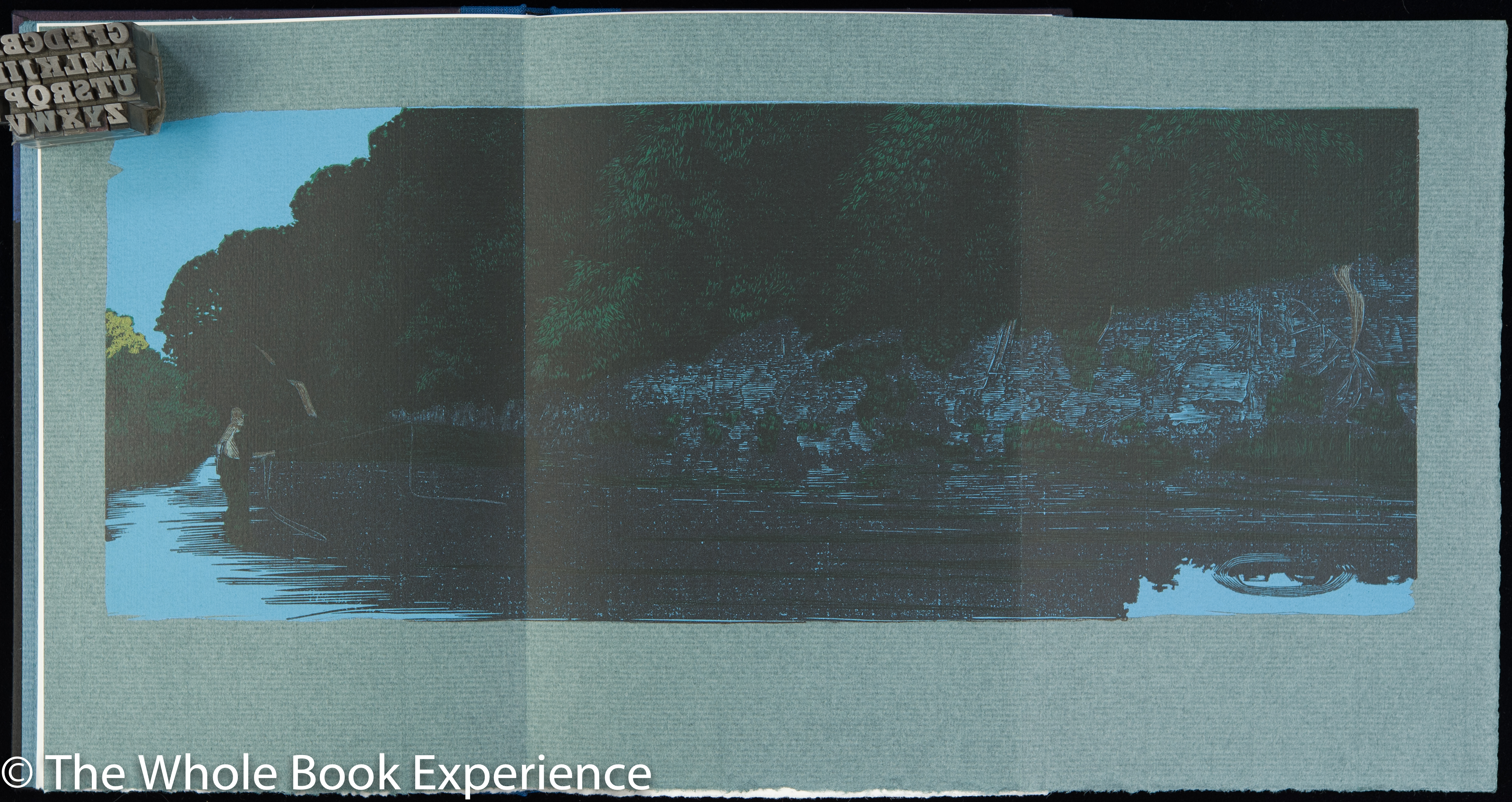 This book is the fifth of nine books printed in Midnight Paper Sales’ “Little Book” series from 1997 to 2010. I couldn’t find much information on the series but the books look like they would be worth seeking out if this one is any indication. The cover papers are striking: looking like the night sky above the trees as the last light fades from the sky. Or maybe the moon is getting ready to rise behind there somewhere. I was intrigued to read in the prospectus that the image was printed on black paper. A two color split-fountain technique was used to get the effect of the sky turning more indigo as you look further above the trees. The fold-out main illustration was done in four colors and features his brother fishing his favorite pool and, in Shanilec’s words, “mercifully fully clothed.” That detail, while certainly a brotherly jibe, makes more sense once one has read the story.