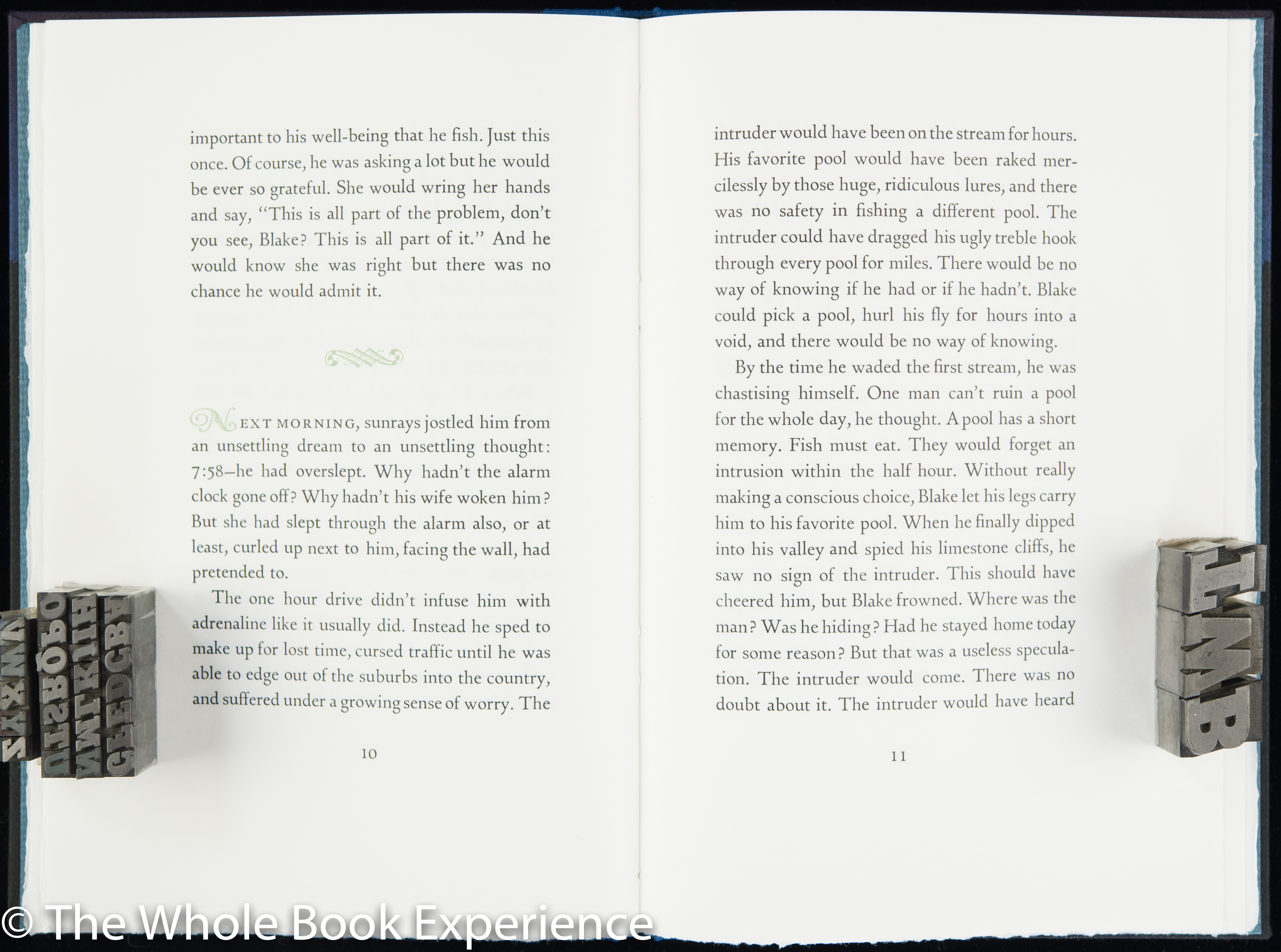 Personal anecdote aside, this is a beautiful little book containing a short story written by Gaylord’s brother Clayton. As the printer states in the prospectus, “My brother Clayton and I have been fishing together all of our lives: most always amiably, and always with an edge of brotherly competitiveness.” I’m not a fisherman but I can appreciate the beauty of a secret spot that seems like it should be yours if you are there first. As well as some brotherly competition. In the wild there is a greater amount of space that feels wrong to invade without an invitation or an query. And it’s much bigger than in the city or in your town coffee shop or bar. With fishing it seems especially true if you are so close that you will effect the chances of others.