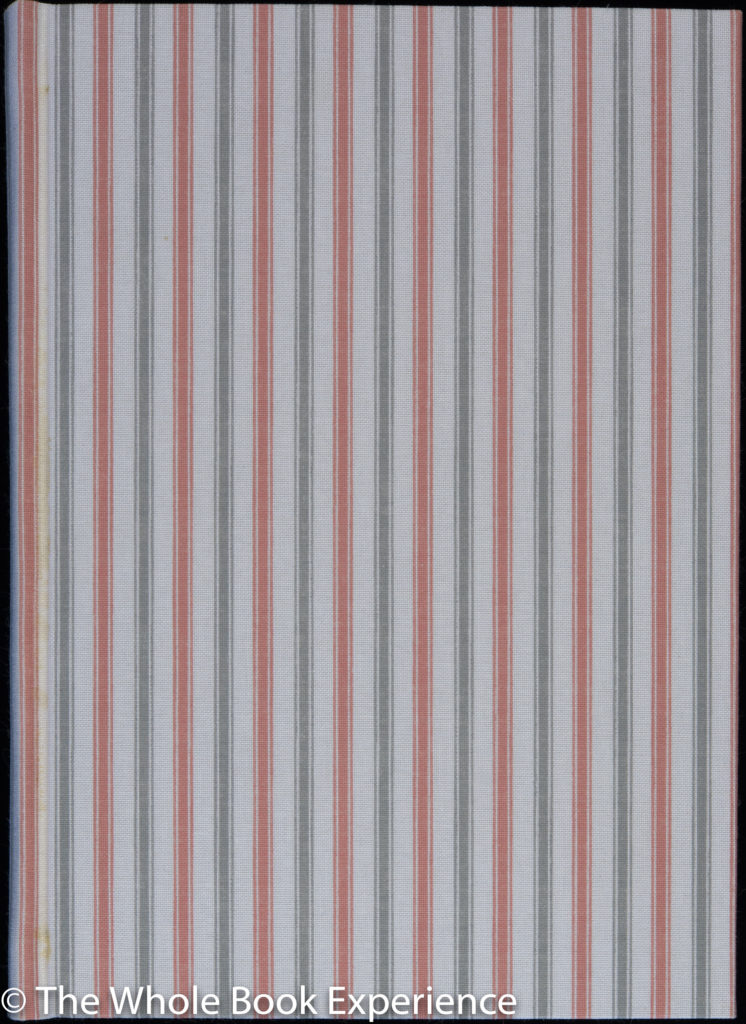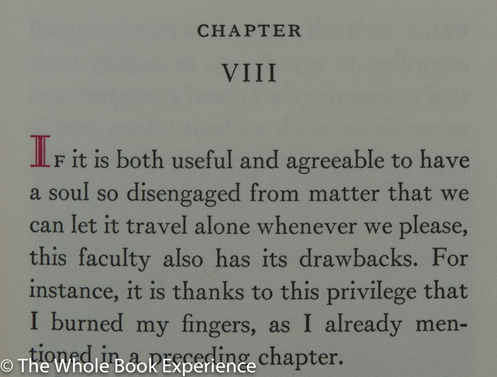 The design of the Arion Press edition hit the feel of this book pretty much right on the nose. The cloth covers, in the aforementioned pink and white (and grey) strike me as perfect now that I wonder if that was the connection they were going for. The small duodecimo format is perfect for a novel of this length and also could be envisioned as the size of book a campaigner like de Maistre might be able to cart along with him through Italy. This is one of the books Arion decided not to slipcase, and as usual, I wholeheartedly disagree with that decision, as a slipcase is always wanted in my library and would definitely be a plus for a book carted in a military convoy. And maybe because of this lack, my copy’s boards are a bit bowed. I’m not sure if a slipcase would prevent that or not or if it is due to some other issue. One other nit with the binding is that there is a brownish stain along the crease of the spine that happens to coincide on the front of my copy with a white stripe in the cloth. I wonder if it is from the glue? On the back cover, the pink stripe is in the crease and I can’t detect any discoloration. So this could very well be an issue just with my copy.