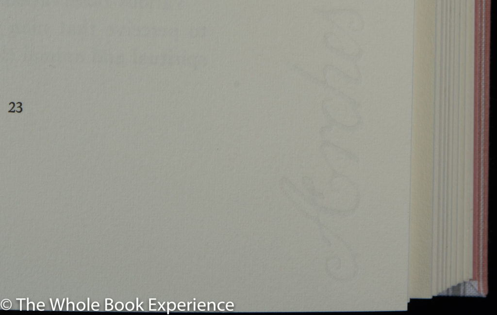 I really like the UV/UltraII paper used for the illustrations. The slight translucence of the paper allows the text behind it to show through and causes the image to be blurred and hard to make out when the page is against the adjacent one but then pops out when the page is slightly lifted from contact with the next. It’s not the same looking through the paper from the backside, so the image is even less distinct. This creates an effect as you read of the image being vaguely discernible when you come upon it against the text block on the recto side as you read the verso text, then comes into clarity as you lift and turn the illustration page, and then fades even further when pressed onto the verso side of the text block as you read the next page on the recto side. I tried to capture this effect in the three photos at the end of the post.