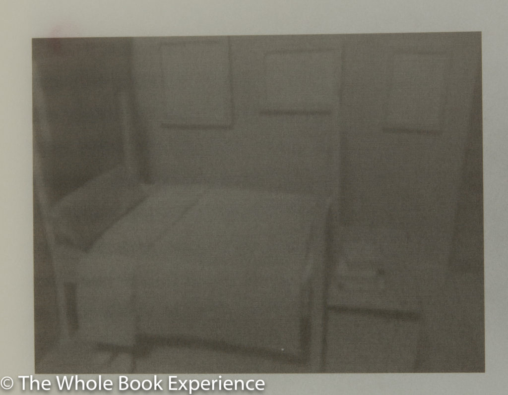 “Architect Ross Anderson took sixteen photographs of models of the room, its furnishings, and the author’s traveling coat, with a cellphone camera. These low-resolution pictures are printed on translucent paper; the result is an elusive evocation of an interior that reflects the interior of the mind.”