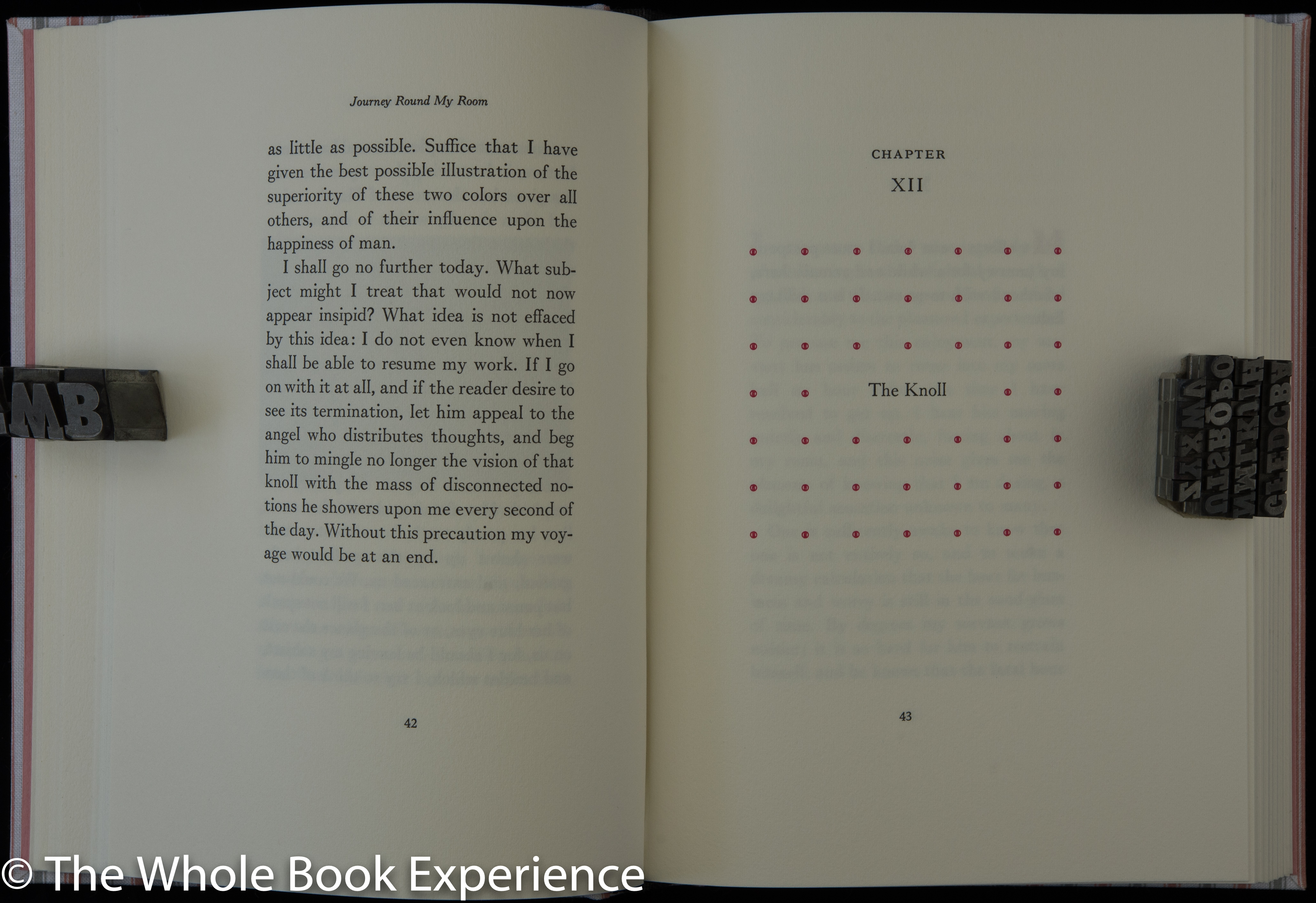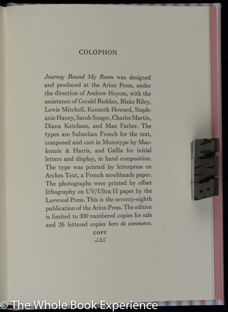 So the pandemic provided a perfect time to revisit Arion Press’ edition of Journey Round my Room by Xavier de Maistre. The author’s confinement of 42 days over dueling seems paltry in comparison to my 100 days and counting. And there are certainly some differences. I am able to leave for essentials, he was not,