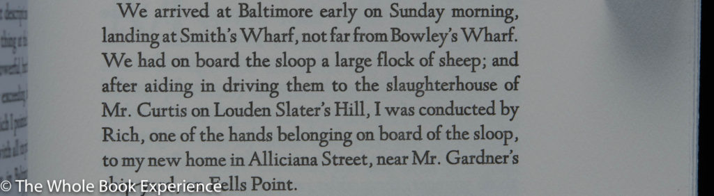 All this personal background is mostly to say that one of the subtleties of this book when I read it this time around is that so many places referenced in his Maryland days are “my” places too. I have often been within a couple of miles of where Douglass was born, as I drove from Annapolis to Tilghman Island where my Uncle lived. When I’d go out to his place, I’d always stop at an empty lot