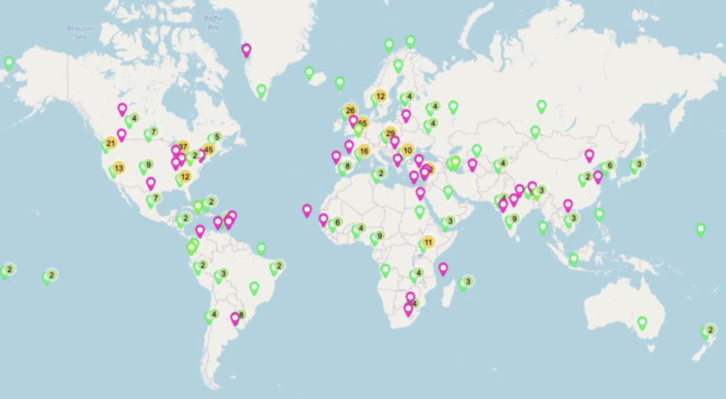As far as reading as widely throughout the world as I can when only really being able to read books in English, I’m doing quite well. Here’s a map of my reading with pins identifying the author’s origin or place of residence, whichever seemed to make the most sense. Green pins are books I’ve read and pink pins are on my TBR pile. Note that this includes books from previous years as well, ever since I started using this particular mapping app.