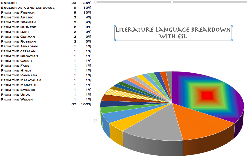 Here are a couple of  charts showing the breakdown of languages for the books in translation and for all the books read: